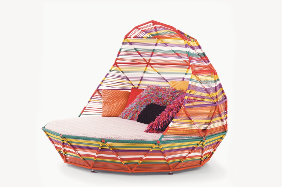 The Tropicalia daybed by Italian manufacturer Moroso. Steel construction painted red. External finishing of woven wire of the multi-colored polymer. The mattress is made of a special polyurethane suitable for street. The design is complemented by a cushion of polyester fiber. A design from Patricia Urquiola model will surely embellish and dilute their flavor to your external environment.