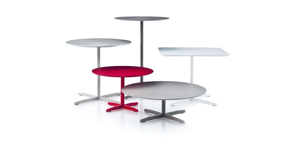 The Roger table from the Italian manufacturer Moroso. Base made of steel in powder coating. The table top is made of MDF with HPL edge or lacquered colours to choose in stock. Factory offers a round table with different diameters and heights. Great for bars, offices or home.