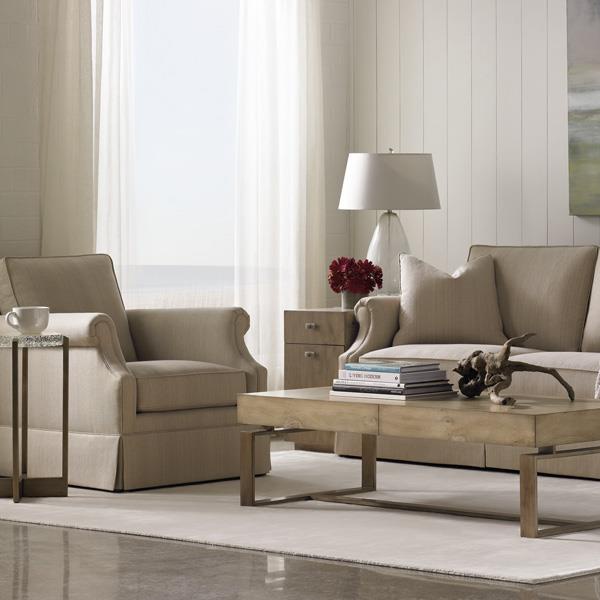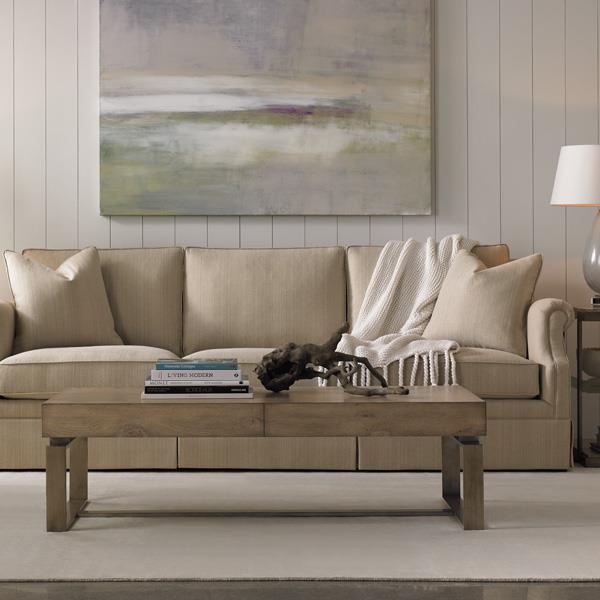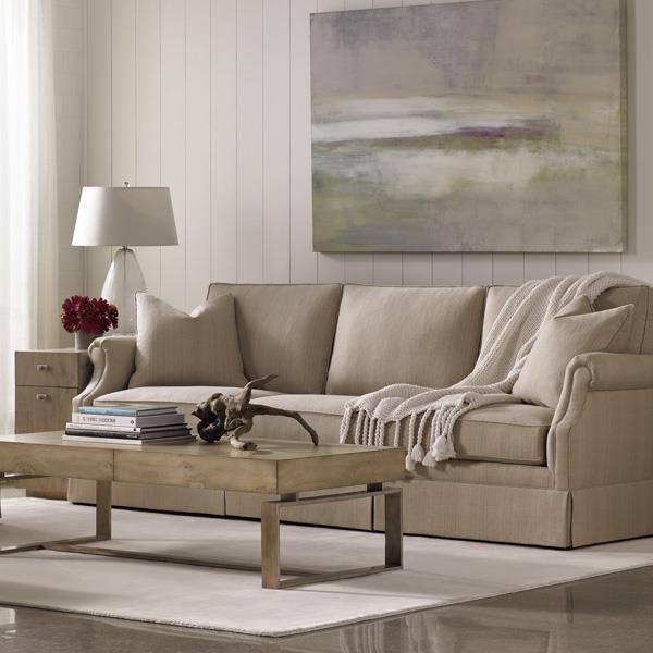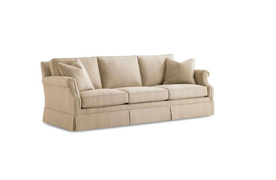 Three-seater sofa Skirted Portland American manufacturer Caracole Light. The presented model of sofa with rounded armrests for small feet. Rectangular cushions are removable. The upholstery is made of light textile. Perfectly complement the interior living room or public spaces in a classic style.