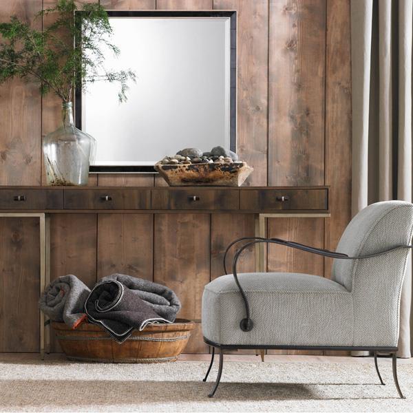 The Mixed Message chair American manufacturer of Caracole Light. Presents the original chair with rounded armrests, wooden frame. Backrest and seat in fabric. A modern solution to complement your living room or home library.
