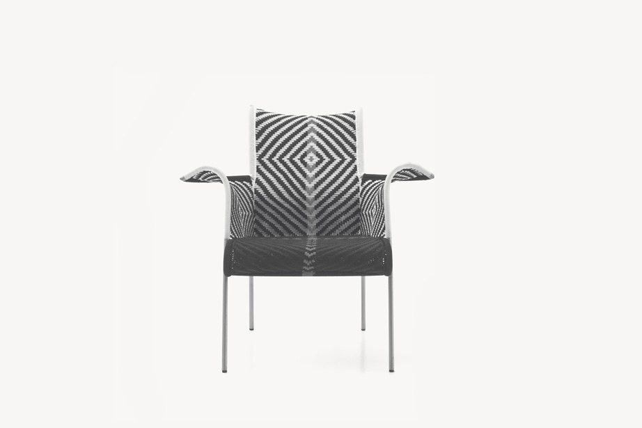 Chair with armrests Iris from the Italian manufacturer Moroso. The frame is made of painted steel. Colorful pattern made from polyethylene strands, handmade. Factory offers four colors. Model with rounded armrests are sure to add flavor to your summer terrace.