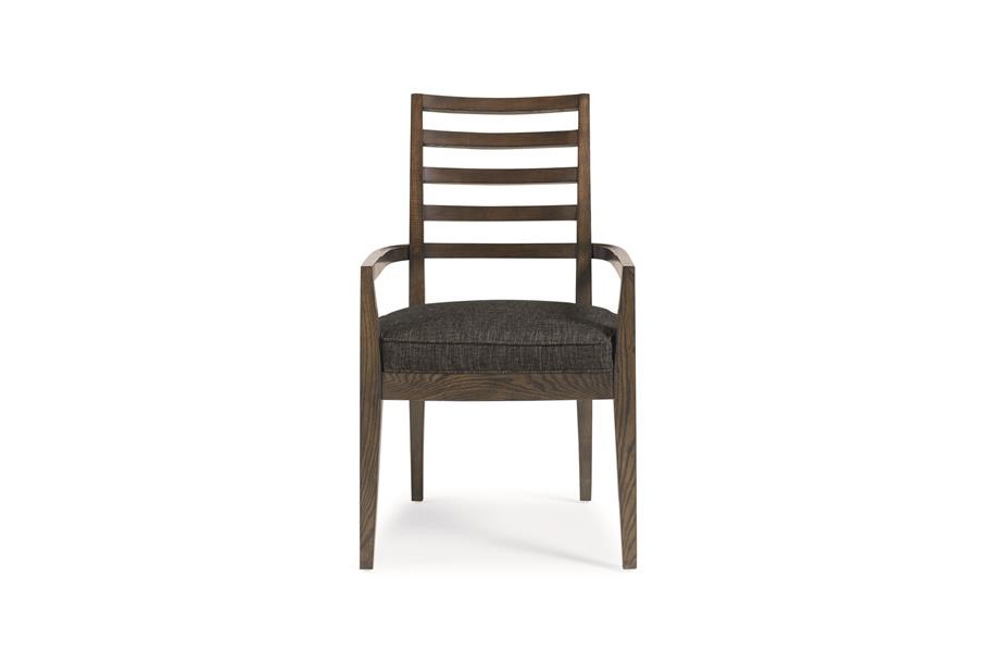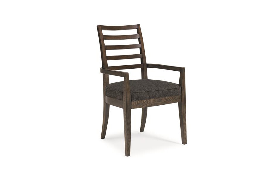 Chair with armrests Bungalow Chair American manufacturer of Caracole Light. Model chair made of natural wood in a dark tone, the armrests hard. Seat upholstered in fabric grey. A modern solution for the interior of the dining room.