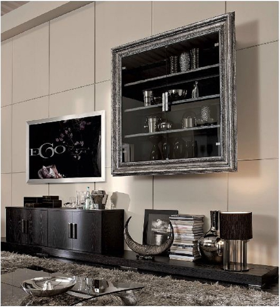 Wall shelf for books Casablanca from the Italian manufacturer EGO. The frame and inner shelves made of wood, wooden frame. Model with three shelves and glass doors, complemented by a decorative carved frame. Shelves are displayed in grey colour with silvering.
