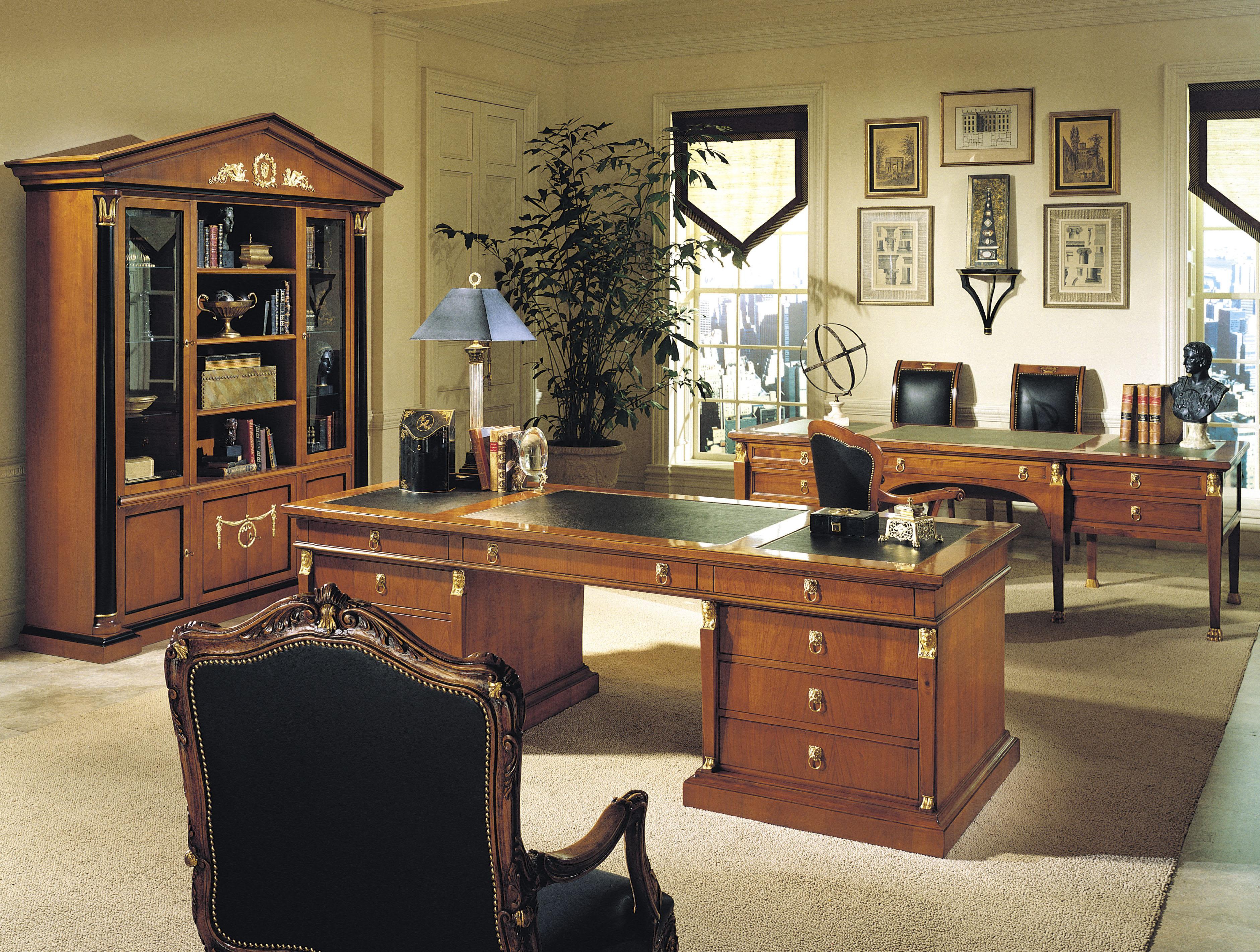 Desk from the Italian manufacturer Francesco Molon, collection Executive. The model is made in the Empire style natural wood decor - carved items (handmade). Metal handles in a gold plated finish. Top genuine leather. Colours in stock.