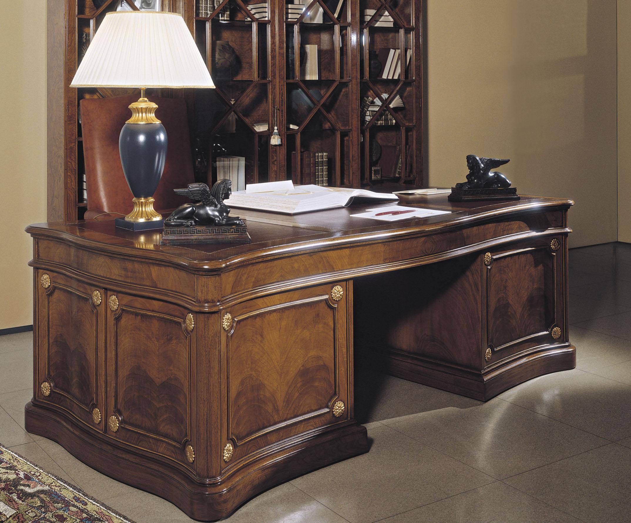 Desk from the Italian manufacturer Francesco Molon, collection Executive. The model is made in classic style of natural wood. Table top trimmed with leather. Handles are metal. Colours in stock.