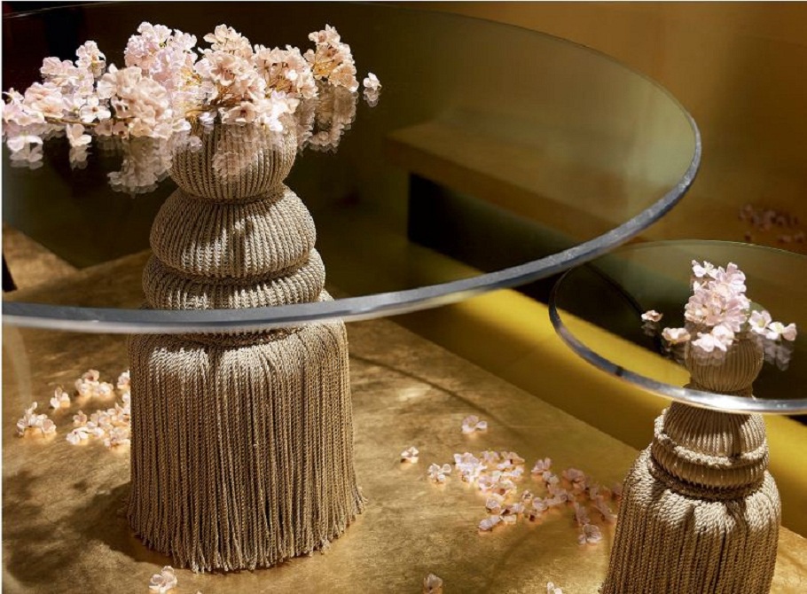 Table Nappa from Italian manufacturer Ego.Round glass table top. One support is made of metal, upholstered fabrics with fringe or suede. Colours: beige. The model is made in modern style. Perfect for dining room or large living room.
