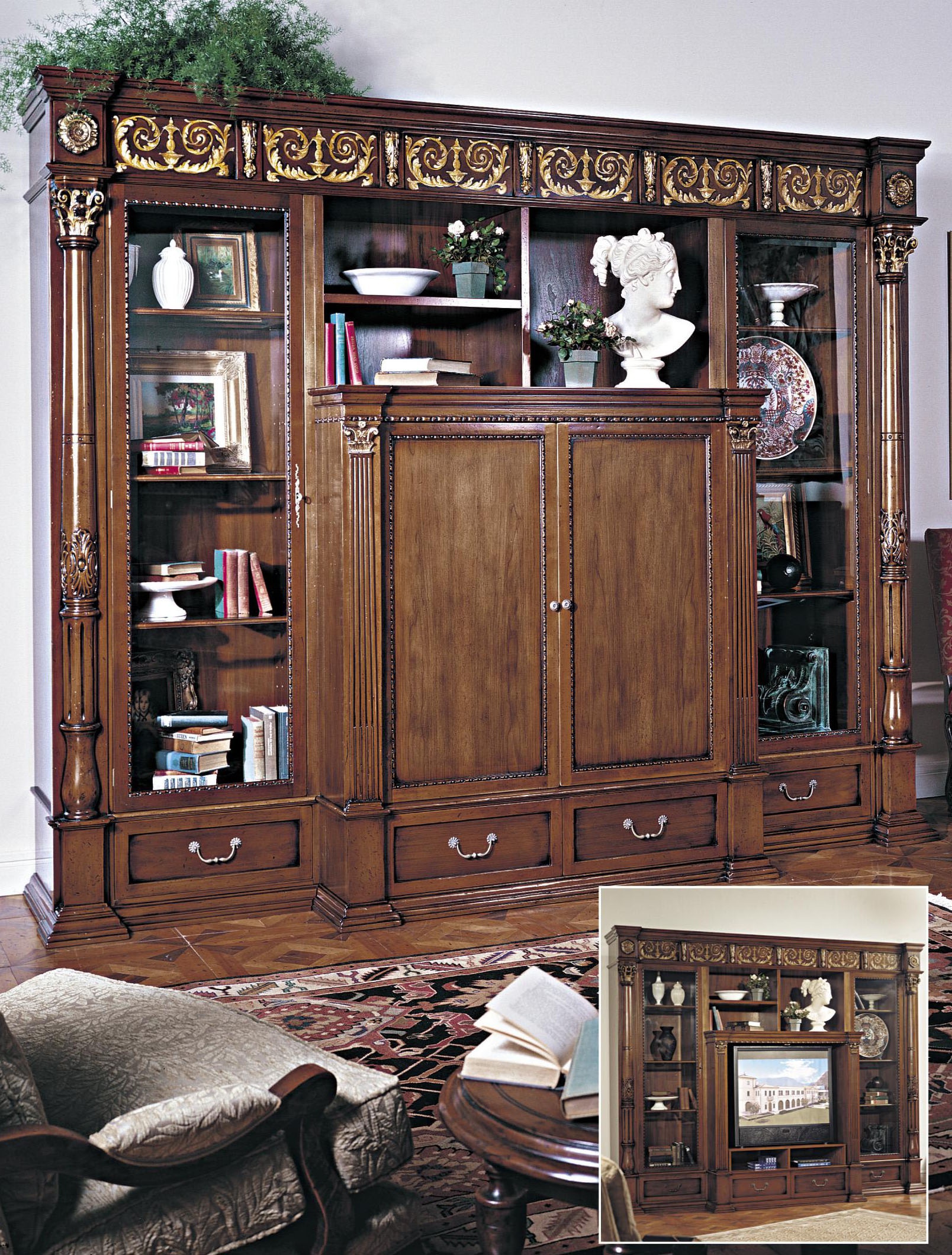 The wall unit for the TV from the Italian manufacturer Francesco Molon. Model from a collection of Italian and French Country made in the classic style. The case of natural wood, finishing lacquer. Carved items - handmade.