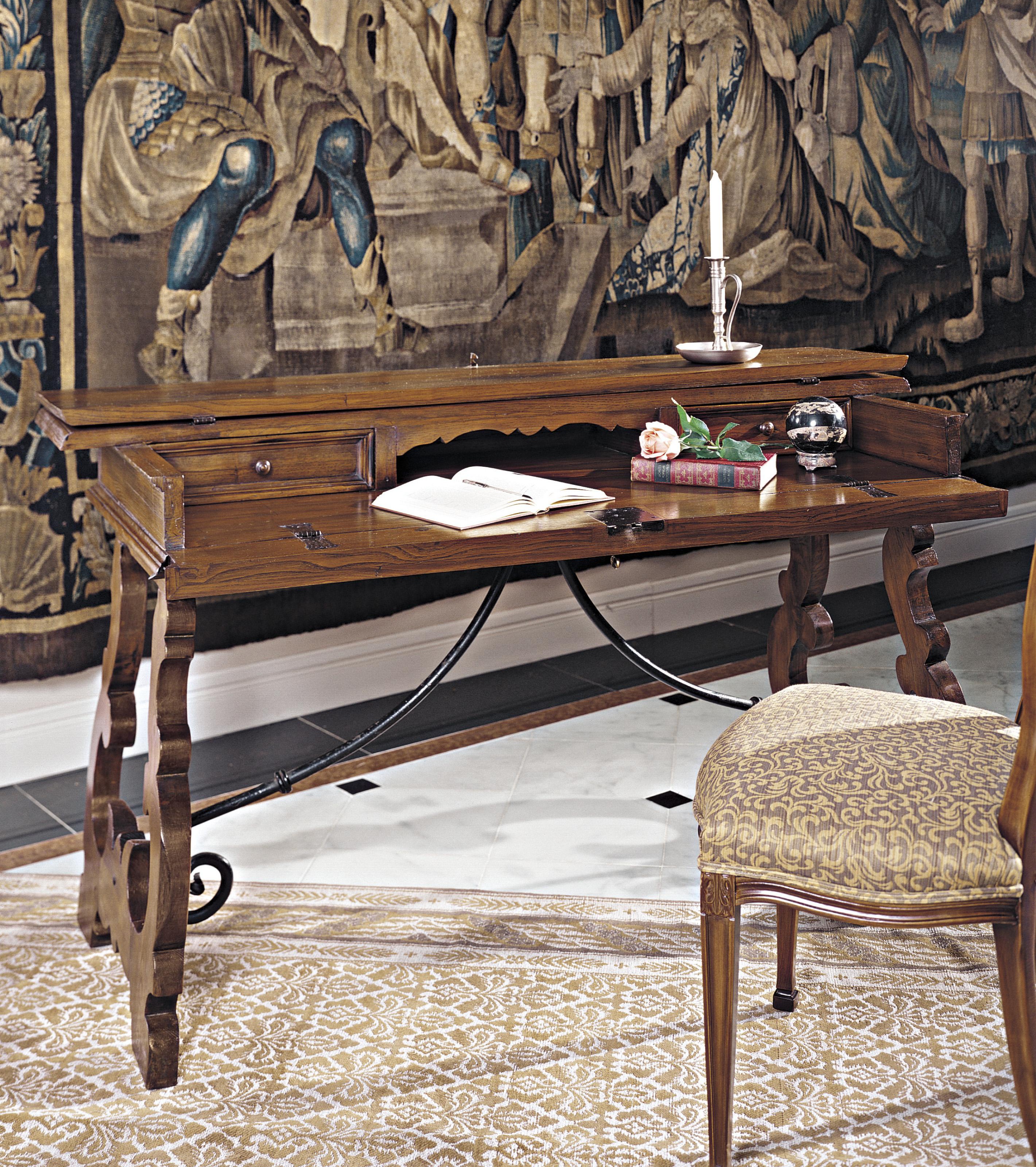 | Description: | Desk, frame in natural wood finish with lacquer. Carved elements were hand made (finish - Antique Walnut/ Heavy Distressing, Semi-Shiny+Pumice). |