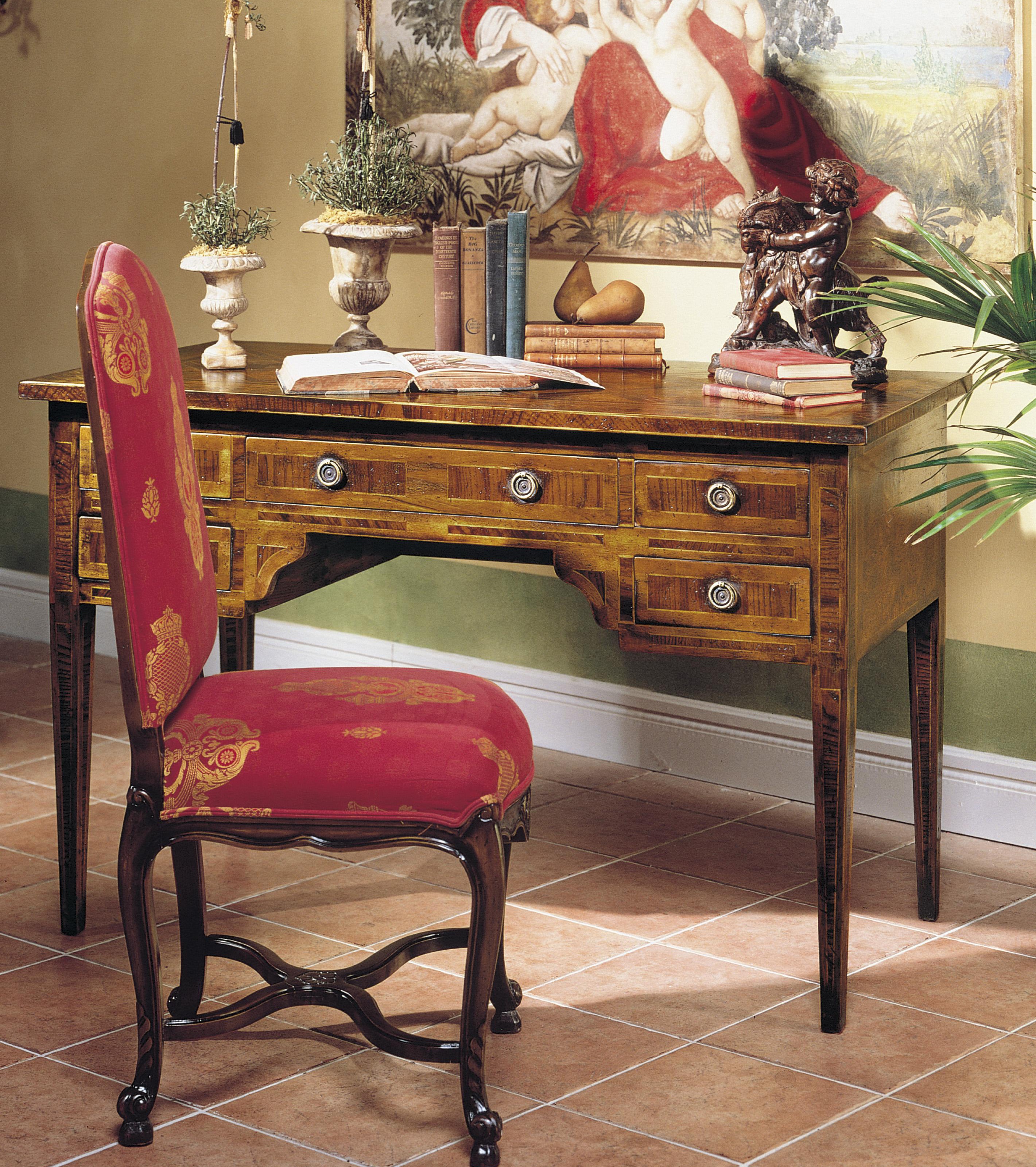 Desk from the Italian manufacturer Francesco Molon. Model from a collection of Italian and French Country classic d?cor. Frame in natural wood finish with lacquer. The model is decorated with inlay. Colours in stock.