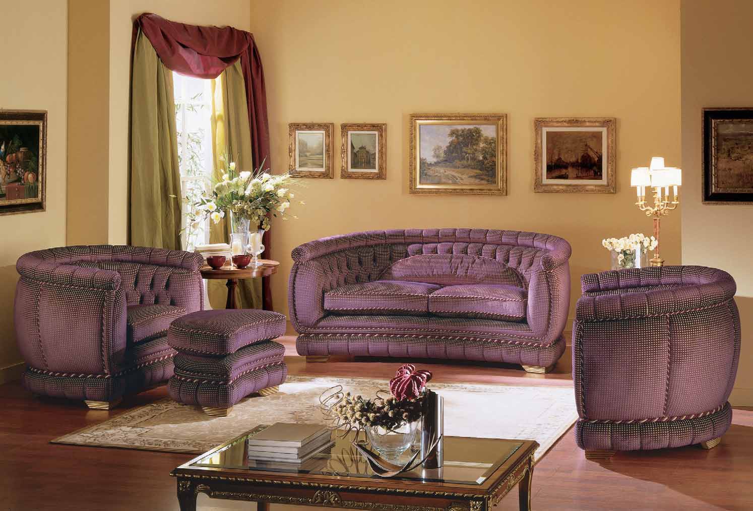 Sofa set Italian manufacturer Polo. Presents set consists of double sofa, armchairs and pouf. The furniture is made on a wooden frame, padding with a soft textile. The decorative stitch Capito. Color in the purple solution.