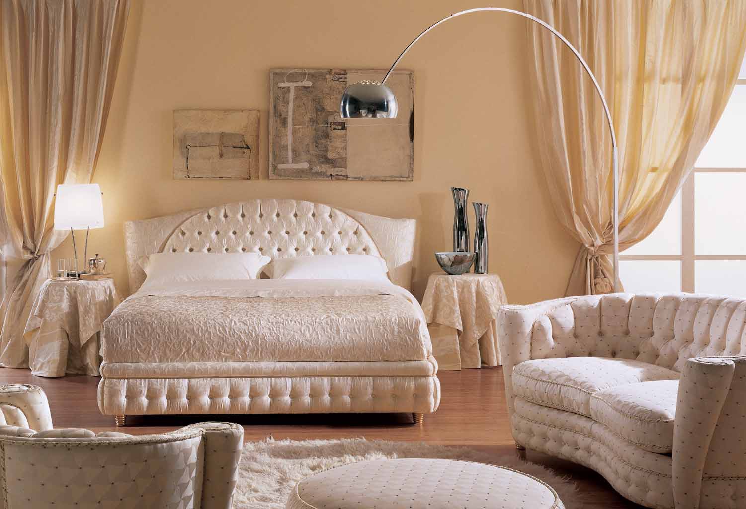Double bed Millennium Italian manufacturer Zanaboni. Presents a model of double beds high with soft, curly head. The model is made on a wooden frame and fully upholstered with textile in pastel colors. Original forms of the head. Trim stitch Capito. Perfectly complement the interior of bedroom in classic style.
