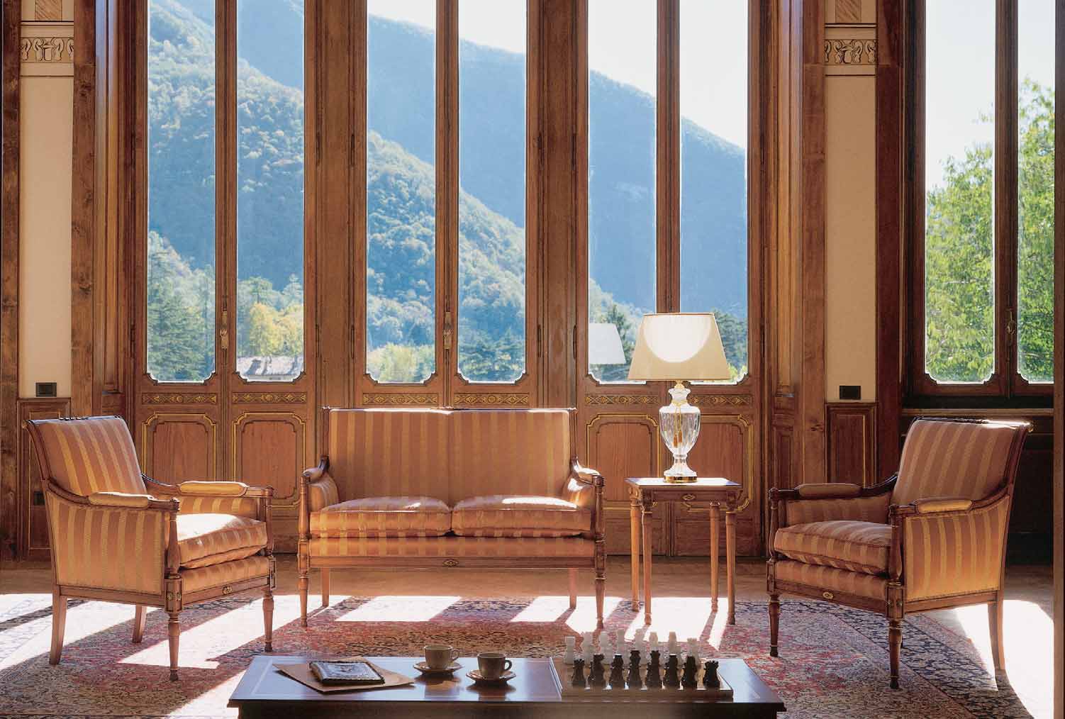 Sofa set Impero Italian manufacturer Zanaboni. The models presented double sofa and armchairs. Set is made on a wooden frame, decorated with handmade carving. Upholstery textiles to choose catalog from the manufacturer. The seat cushion is removable, of square form. Perfectly complement the interior in a classic style.