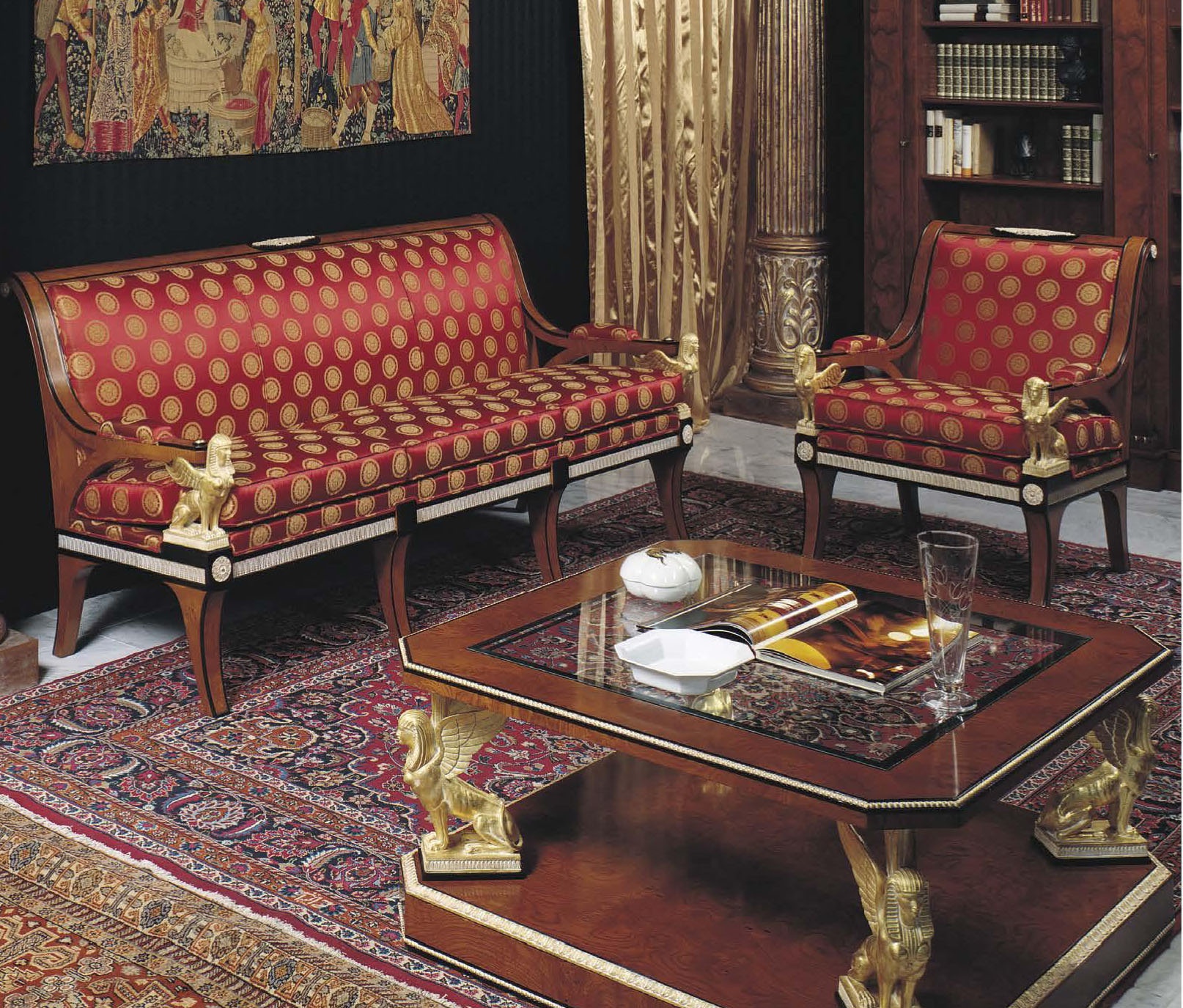 Sofa set from the Italian manufacturer Francesco Molon. Model of the collection, The Upholstery executed in the Empire style. Frame made of wood in the finishing varnish. Upholstered in a choice from a range of companies. Colours in stock.