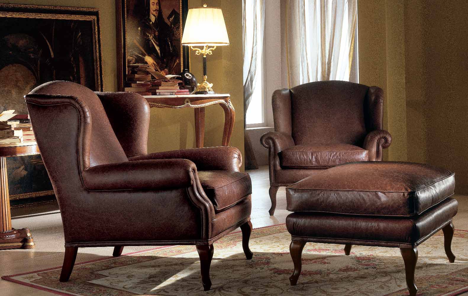 Armchair with pouf maxi York Italian manufacturer Zanaboni. The presented model of a high-backed chair and pouf table is mounted on a wooden frame upholstered in natural leather brown tone. Offer for classic interior living room.