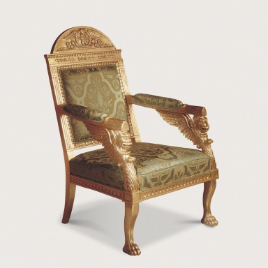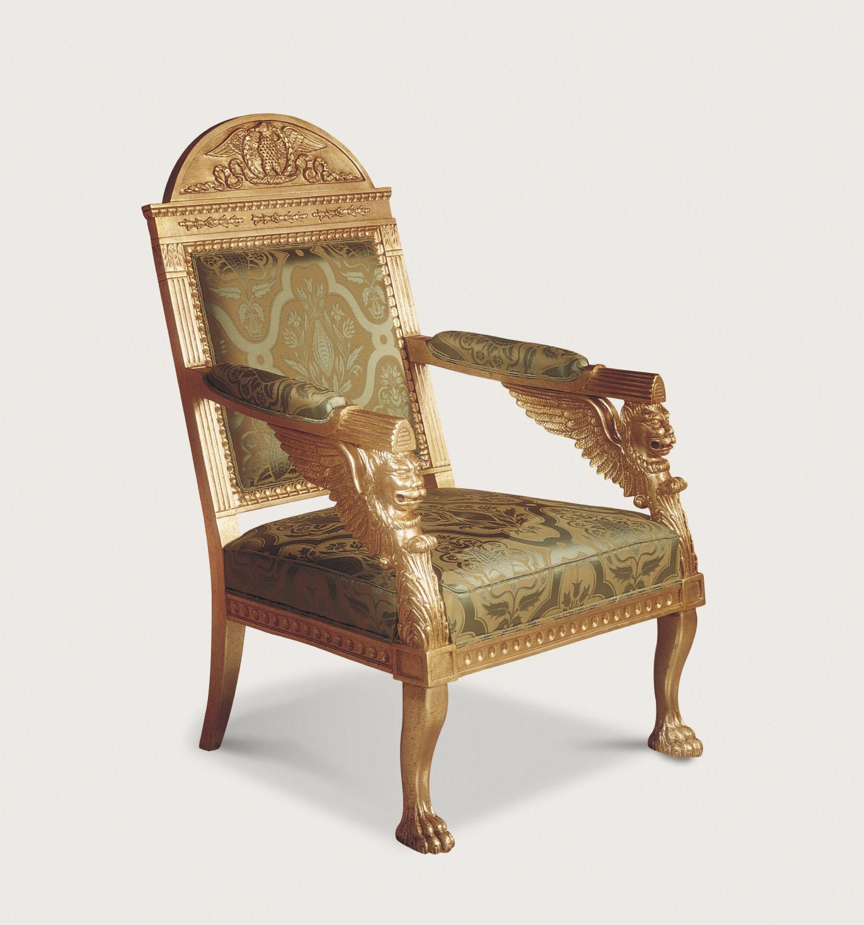 Low chair from the Italian manufacturer Francesco Molon. Model of the collection, The Upholstery executed in the Empire style. The frame is made of wood. Upholstery - textiles from the company portfolio. The model is decorated with carving and gilding. Colours in stock.