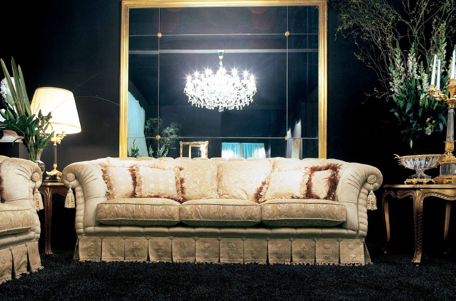Three-seater sofa RICORD Italian manufacturer Zanaboni. A sofa on a wooden frame, a filler of polyurethane foam. Upholstery textiles with gold embroidery with decorative inserts and shovchik. Will perfectly complement a bedroom in the Baroque style.