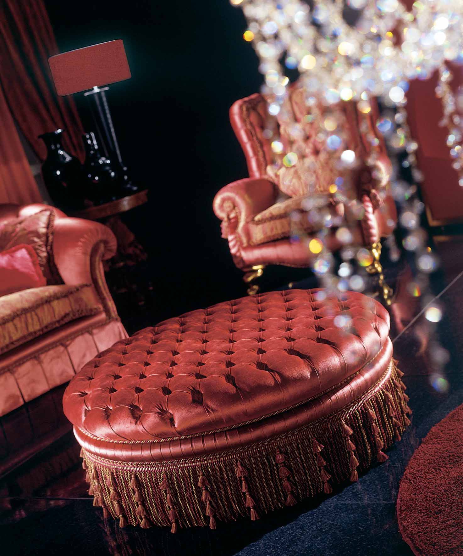 Pouf round Piramide Italian manufacturer Zanaboni. The model of the stool on a wooden frame in a soft fabric. Colour matching is possible to choose the catalog from the manufacturer. Decorated with stitch Capito. The perfect solution to complement the interior living room in Baroque style.