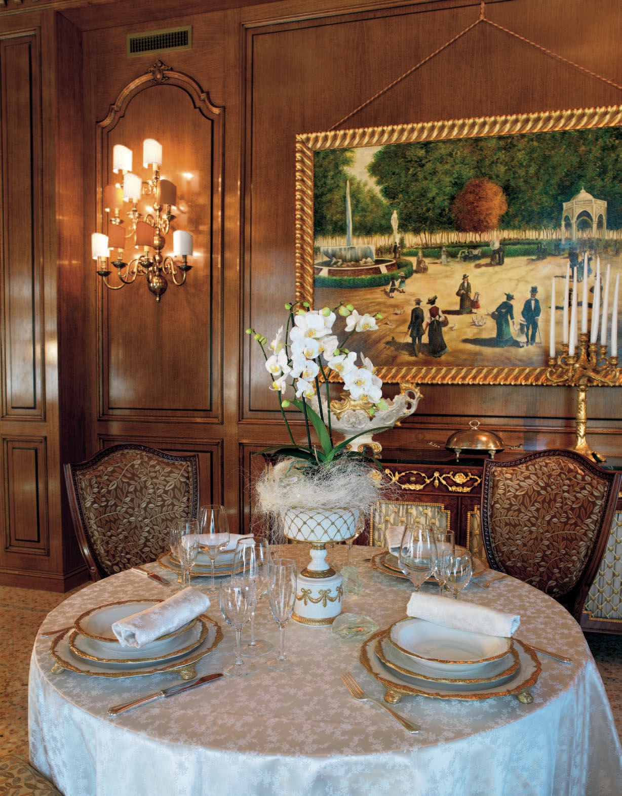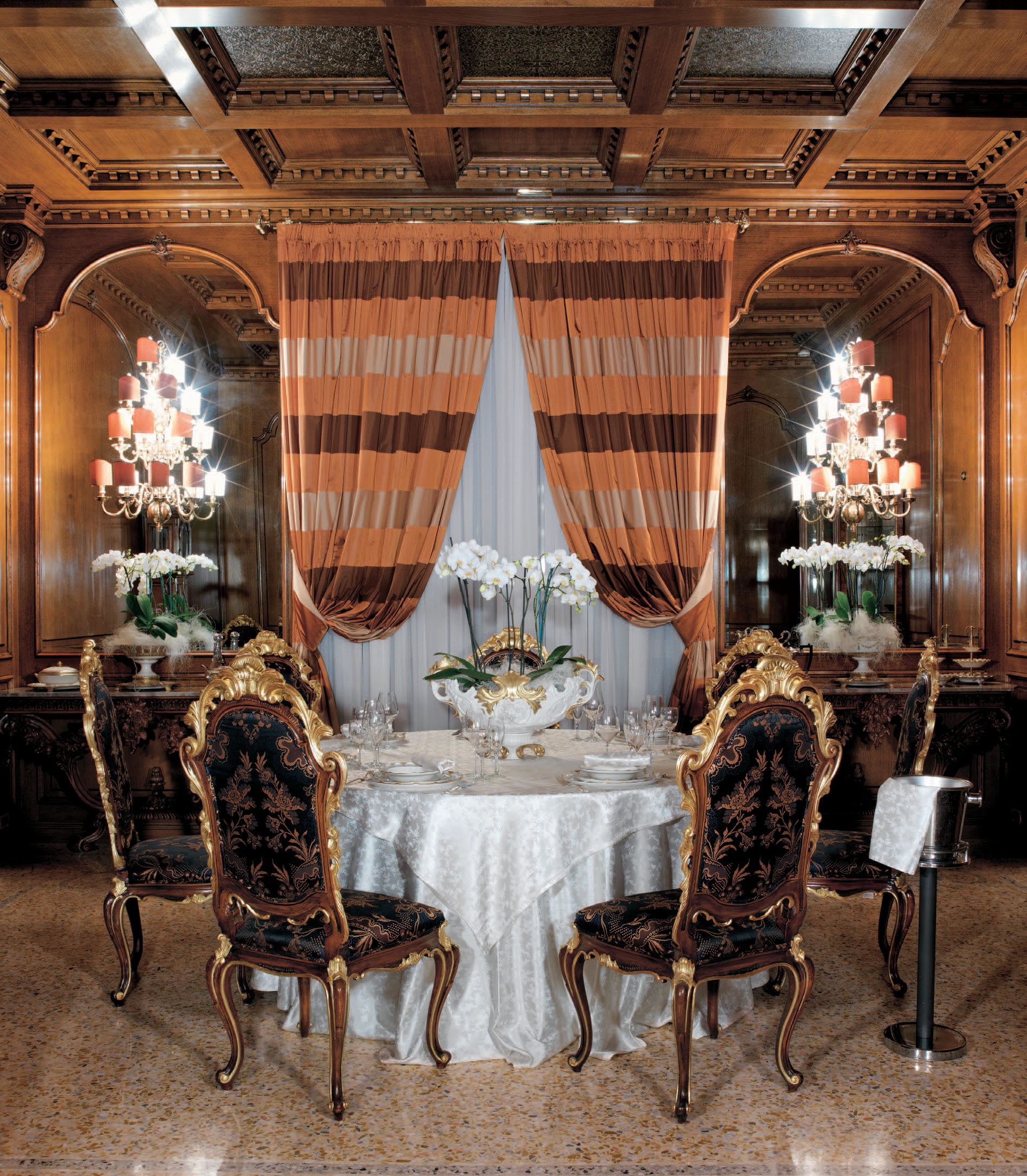 The dining room in the hotel Molon Hotel from the Italian manufacturer Francesco Molon collection Contract Division. Furniture made of natural wood. Upholstery - textiles. Magnificent wall panels of solid wood. The photo shows a ready-made solution. Factory accepts custom orders to create exclusive furniture and interiors according to customer requirements.