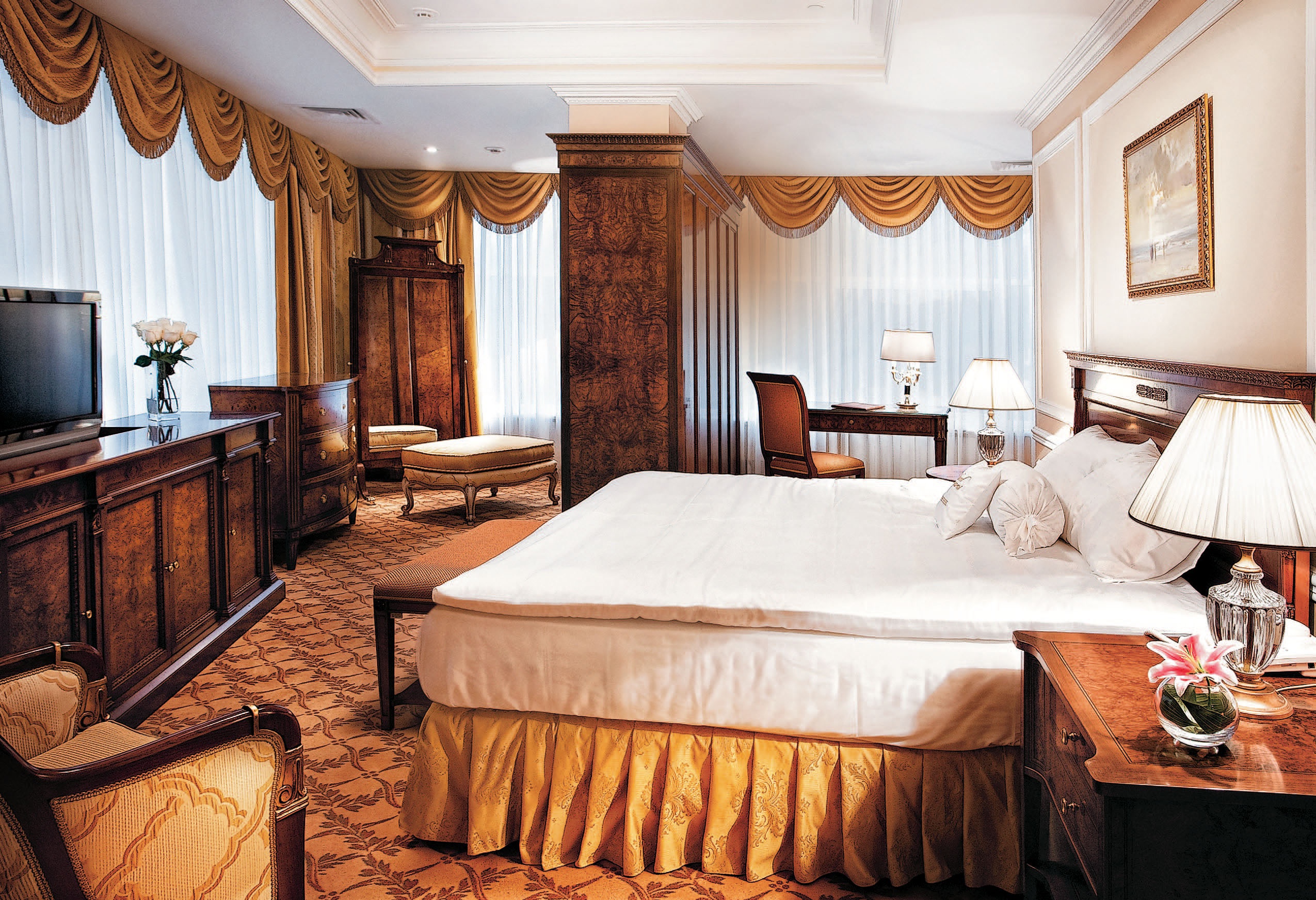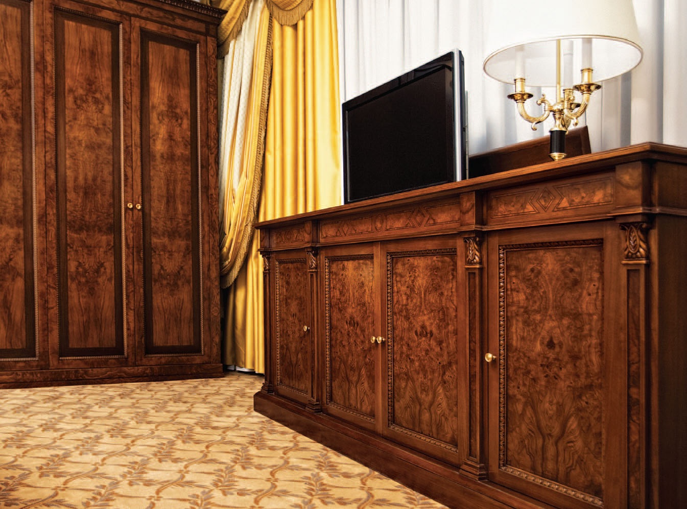 Bedroom in a luxurious room from Italian manufacturer Francesco Molon collection Contract Division. The furniture is made of natural wood and decorated with inlay. Upholstery - textiles. The photo shows a ready-made solution, factory accepts custom orders to create exclusive furniture for the size of the customer.