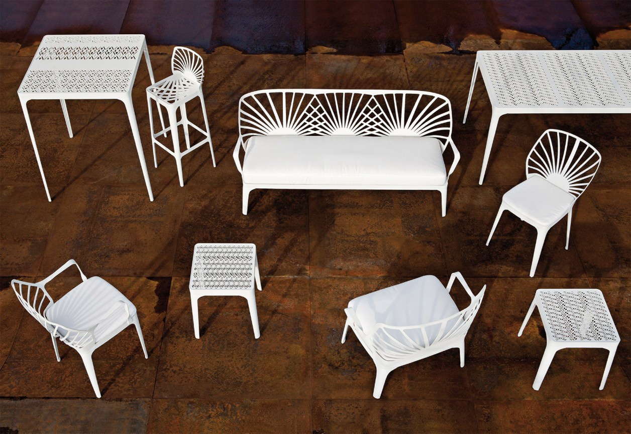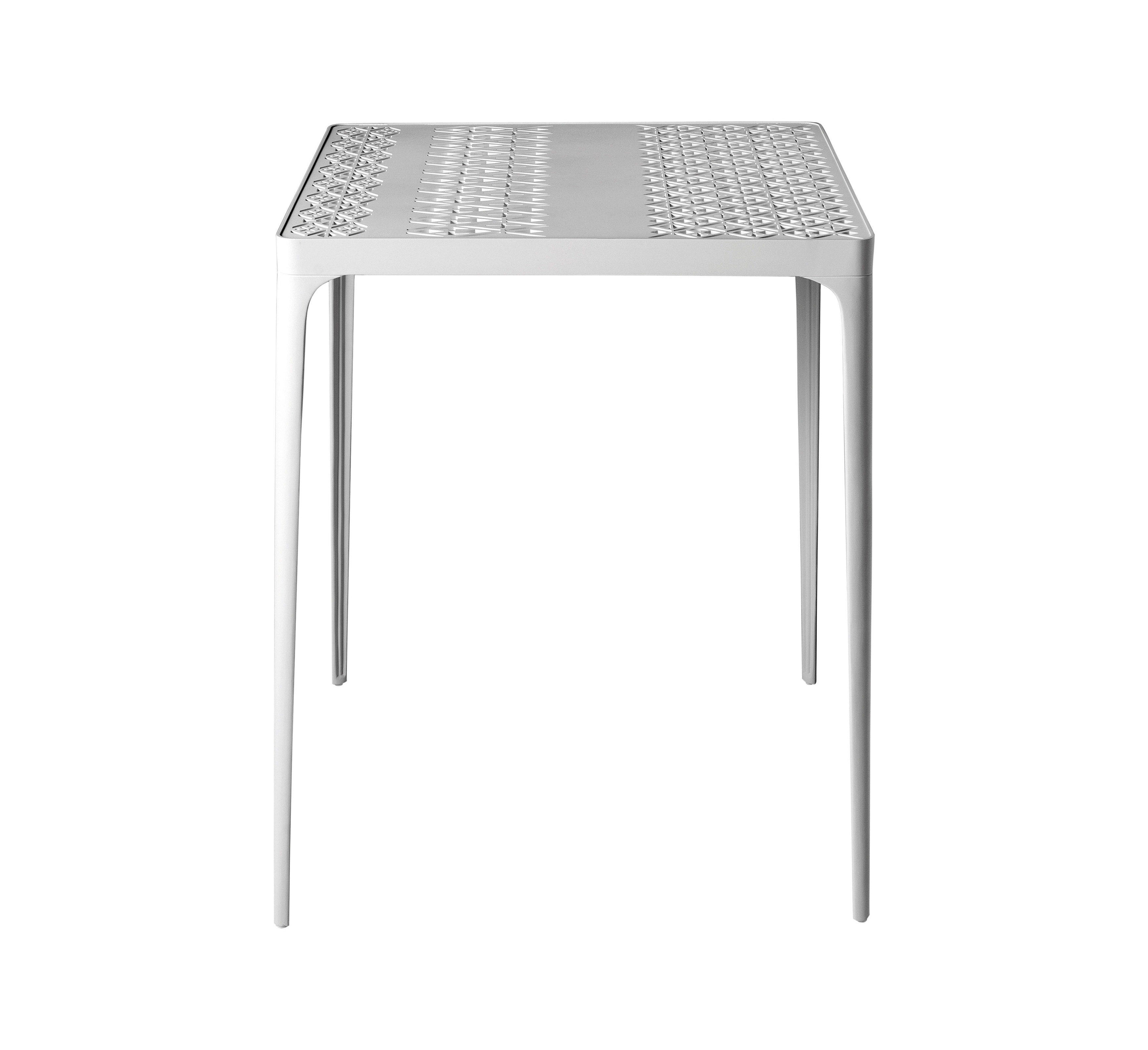 The Sunrise table from the Italian manufacturer Driade. Model square shape on high legs. Frame and worktop made of aluminum and painted white. The table in contemporary style is designed for use on the terrace.