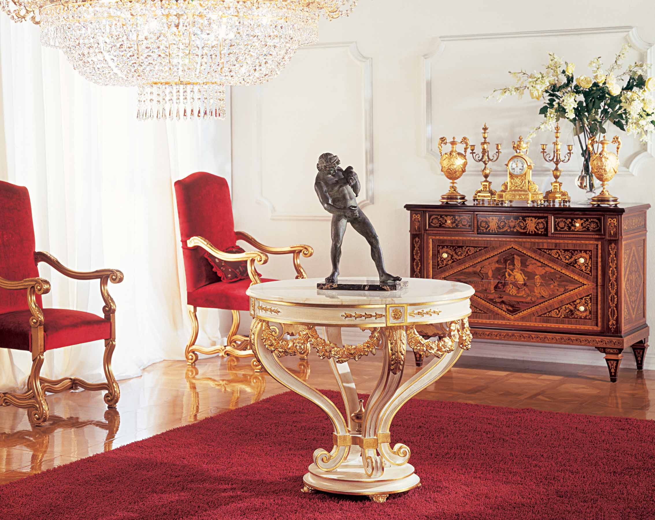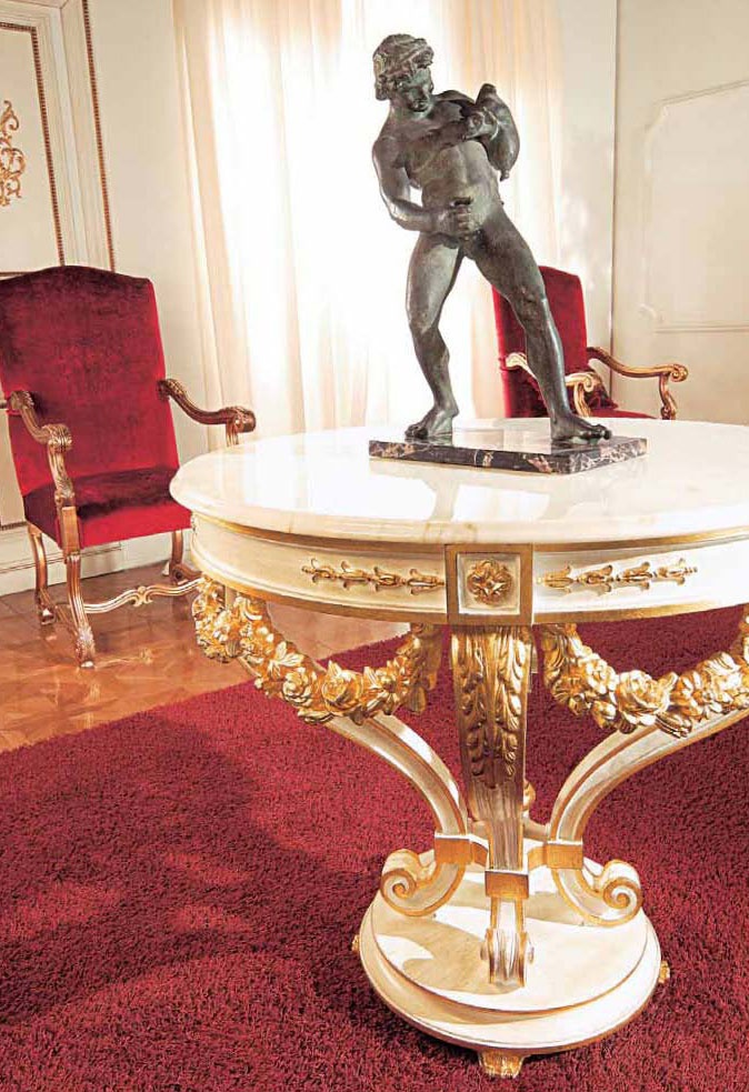 Table round Italian manufacturer Zanaboni. Presents table with round top the table tops and lower shelves. Legs model figure. Model white color with Golden decorative elements. Designed in the Baroque style.
