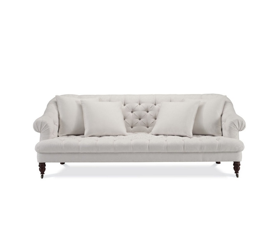 Sofa Higgin's from an American manufacturer Ralph Lauren Home. Model with rounded armrests, is made with a frame made of wood and upholstery textiles. Carved wooden legs made from mahogany. Front legs on castors. The sofa has four decorative fringed pillows.