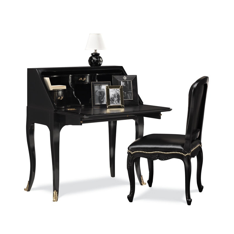 Bureau of Duchess from the American manufacturer Ralph Lauren Home. The model has an elegant black color, gold hardware, lots of different compartments and a spacious pull-out drawers and hinged door replacing a Desk. The Bureau made in the art Deco style.