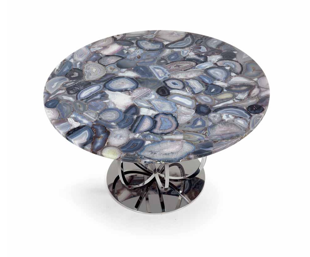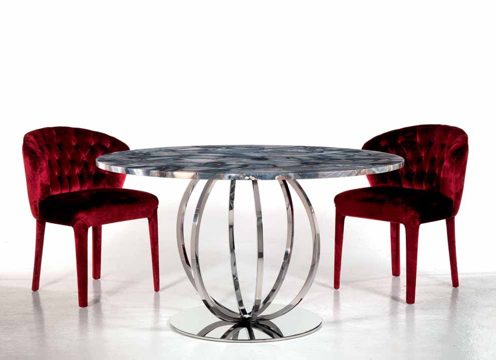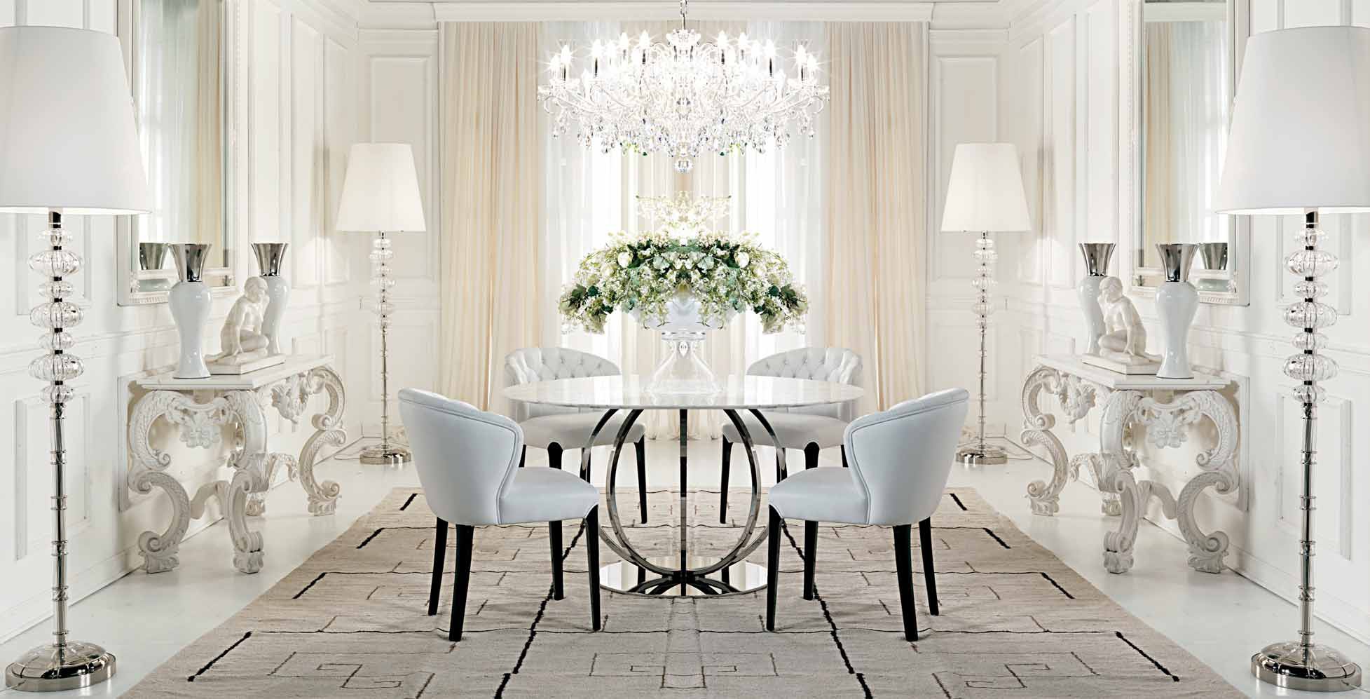 Agata dining set for the Italian manufacturer Zanaboni. The presented models of table and chairs with a high back on two legs. The backs of the chairs are finished with stitch Capito, the upholstery is genuine leather in white tone. The table on the original metal leg, top of stone. Perfectly complement the interior in the Baroque style.