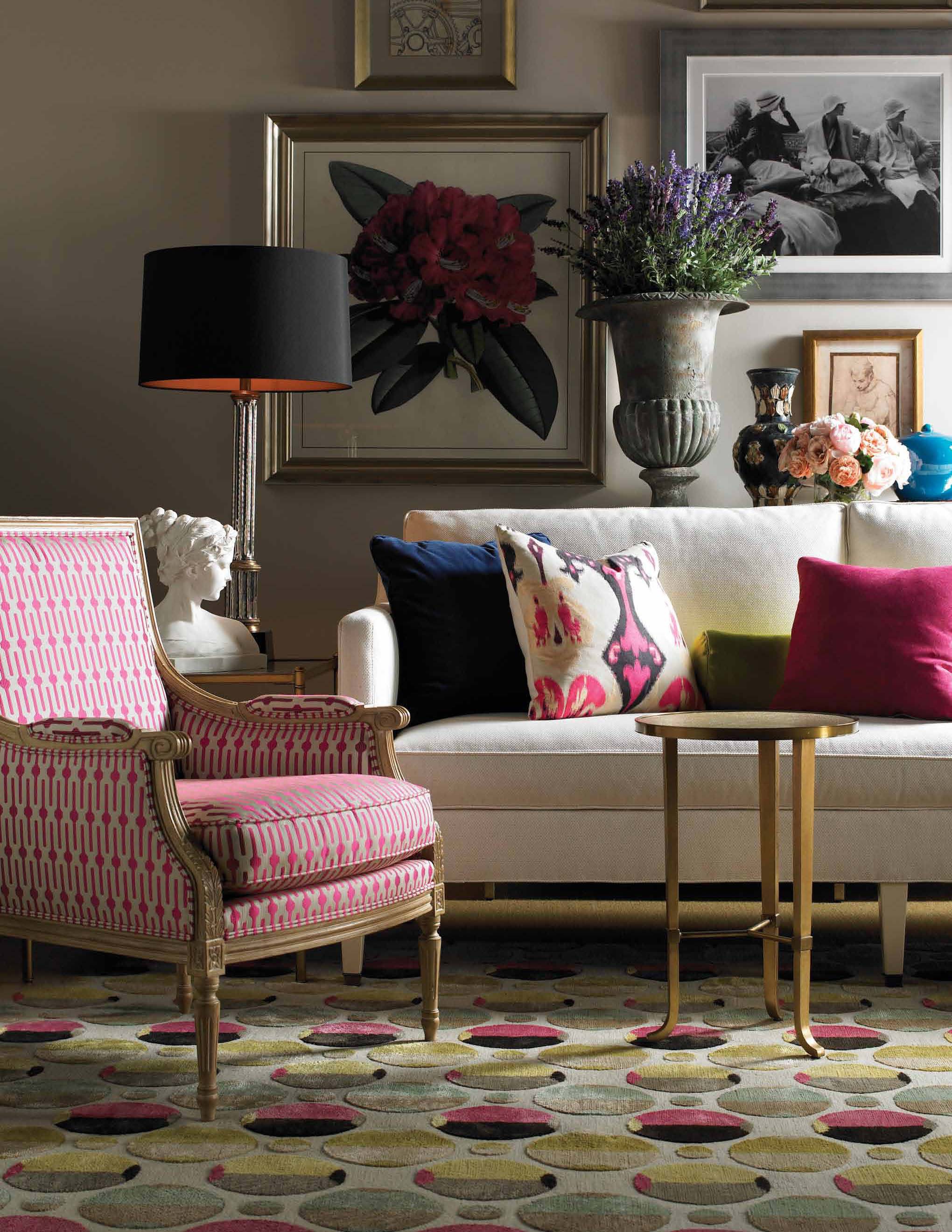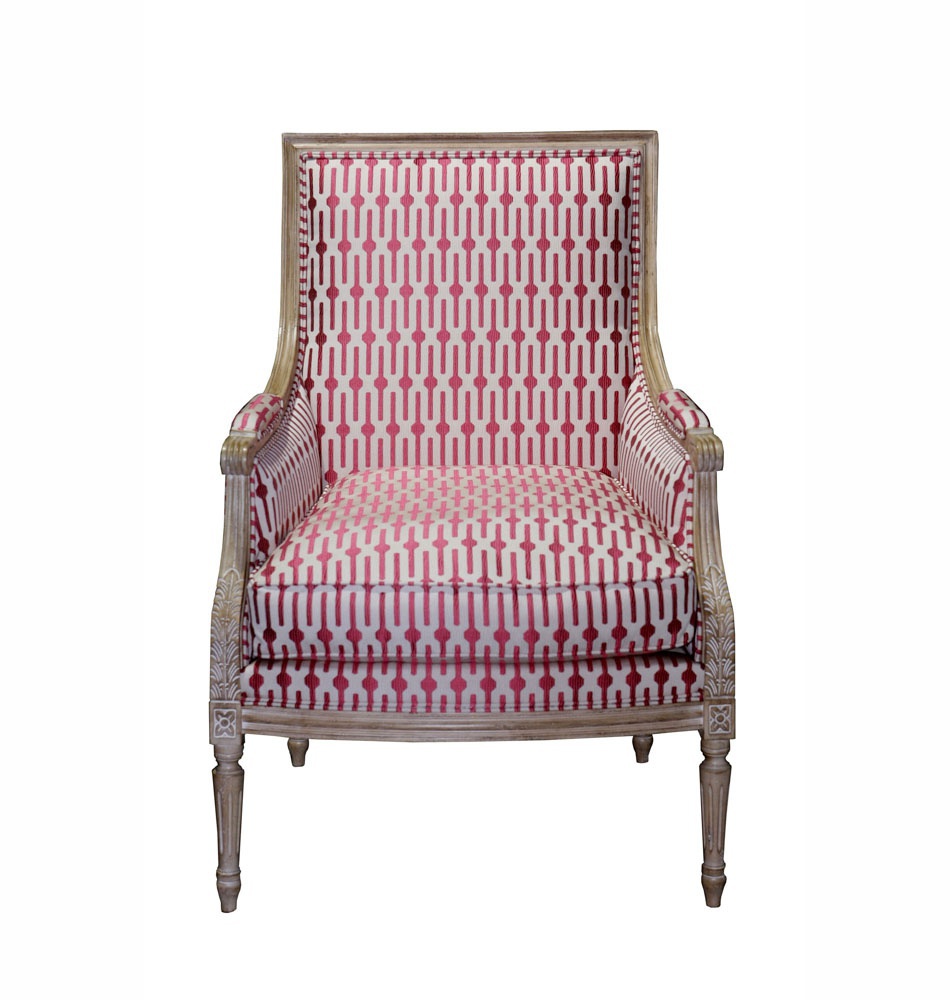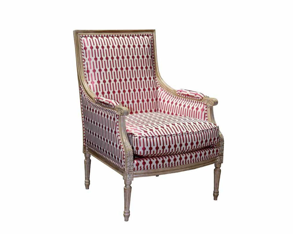 The high-backed chair Exeter from the American manufacturer Lillian August. Textile upholstery in a caramel tone fuchsia fixed decorative metal furniture studs. The furniture is executed in classical style. Standard finish is walnut, the photo shows a model under American Linden, and other available finishes. Carved decor of the frame emphasizes the refinement of interior. Colours in stock.