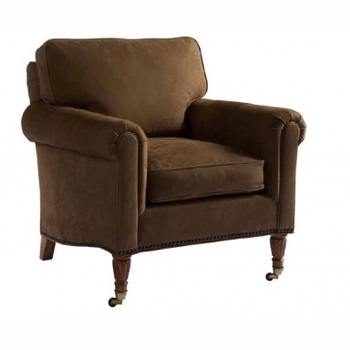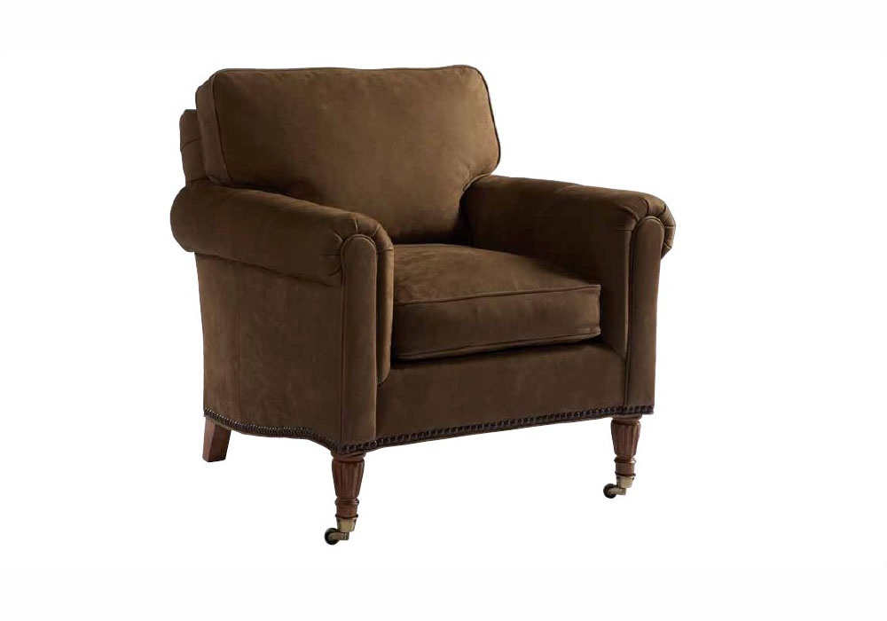 The soft high-backed chair Eldon from the American manufacturer Lillian August. The chair is made in a classic style. Textile upholstery in olive green. Color variations in the manufacturer's catalogue. Frame made of wood the color of brandy, the front legs carved, lacquered with wheels. The furniture will perfectly fit into the classic interior and will emphasize the exquisite style of the room.