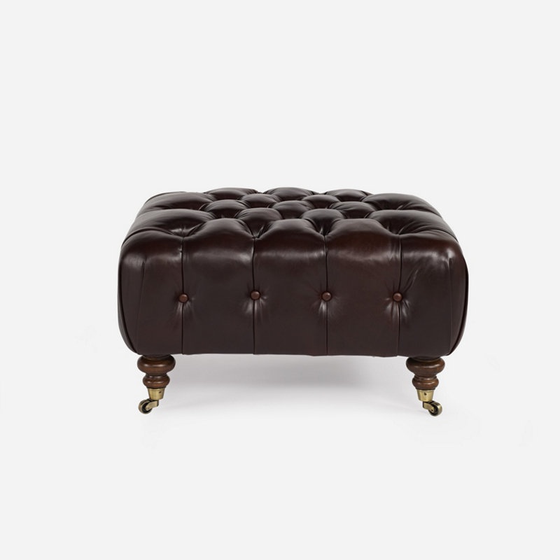 Poof Aldwych from an American manufacturer Ralph Lauren Home made in a classic style. An elegant model that will add comfort to any room. The wood frame and upholstery in soft leather. Wooden carved legs on casters made of mahogany.