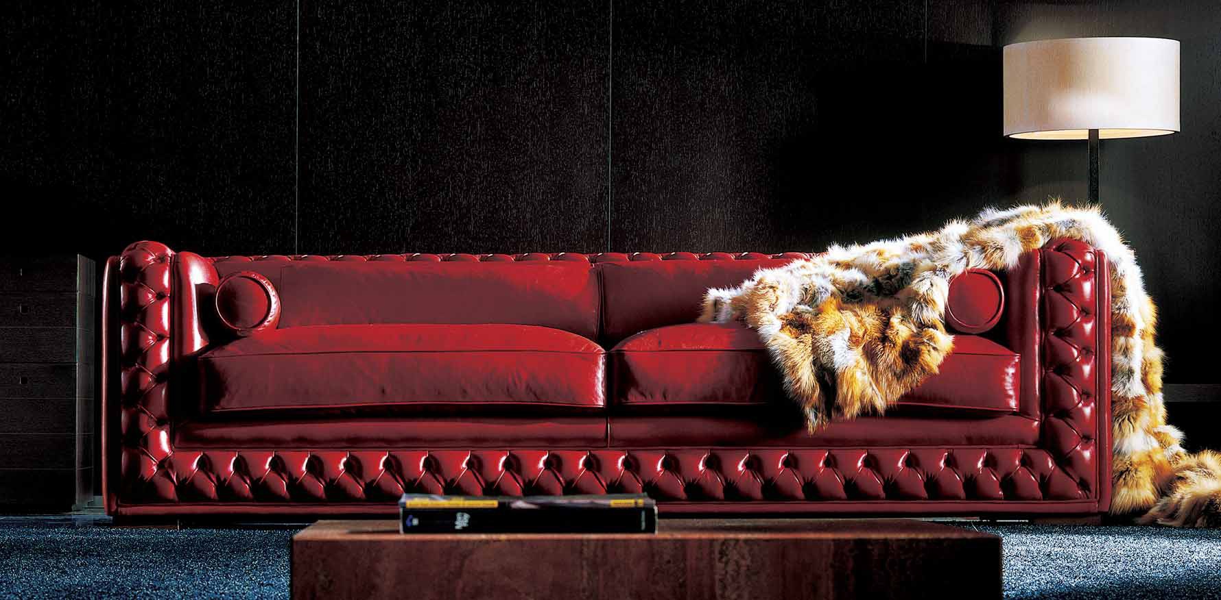Three-seater sofa Atlantique Italian manufacturer Zanaboni. Presents a model three-seater sofa fully upholstered in leather. The model is a rectangular shape, the armrests and the backrest are decorated with stitch Capito. Color in purple tone. A modern solution for living room.
