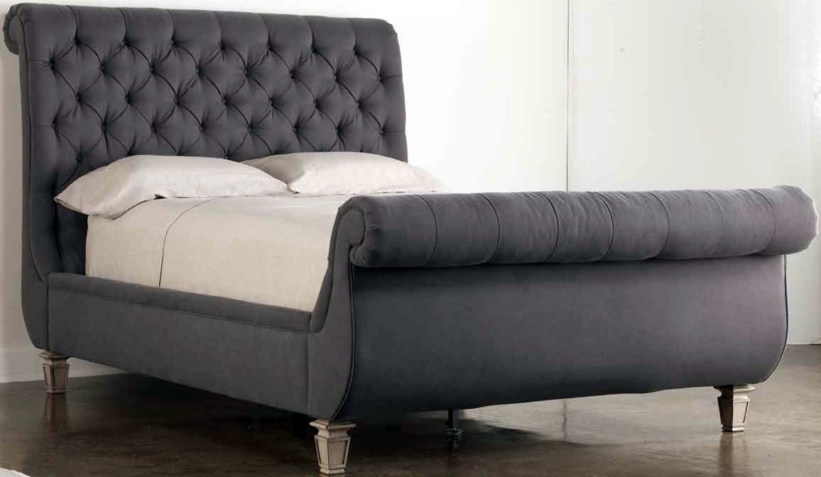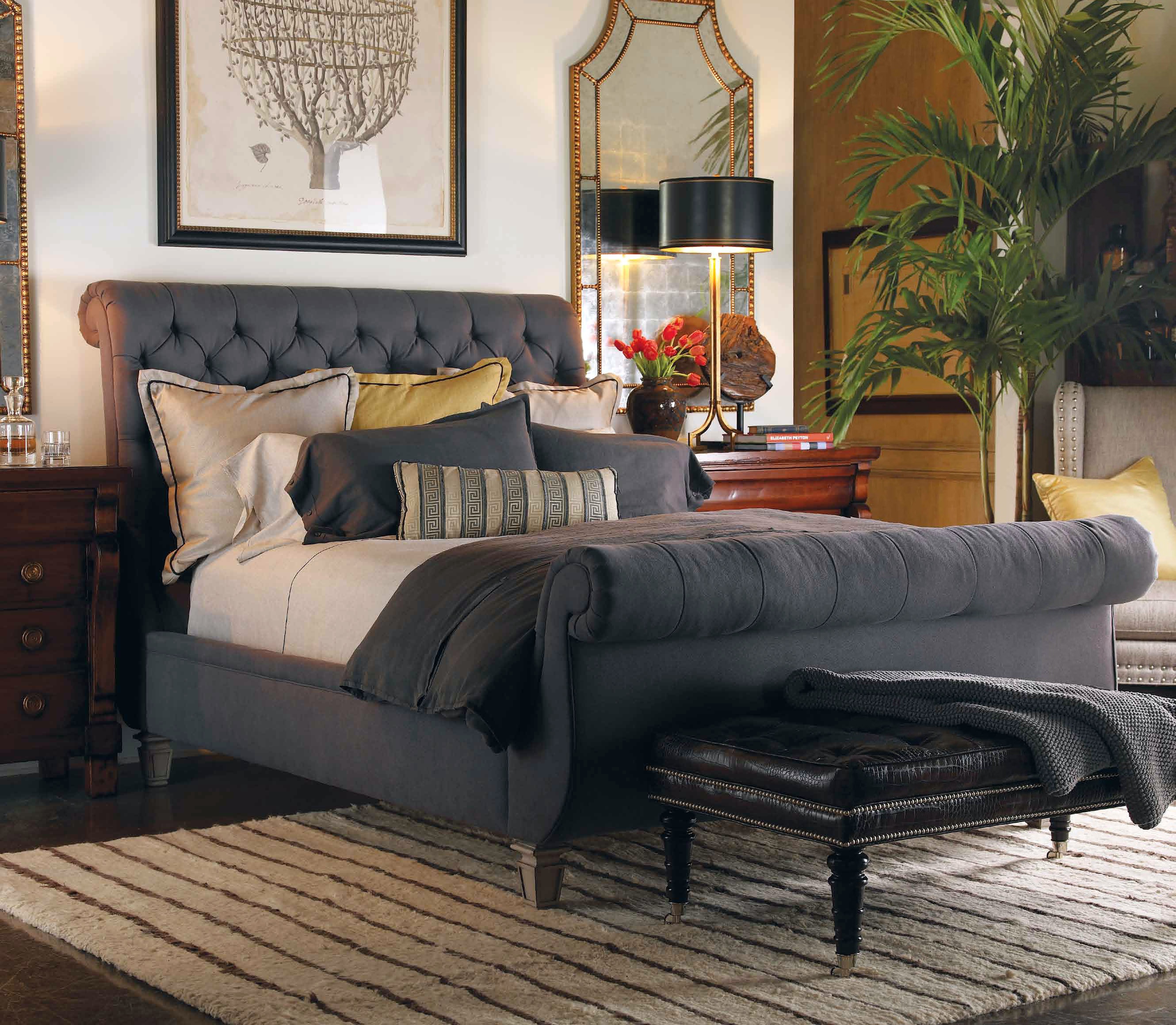 Bed with high headboard Devonshire from the American manufacturer Lillian August. The furniture is executed in classical style. Bed frame is made of durable solid wood that makes it durable in use, the legs are decorated with a manual carving. Textile upholstery ashen high upholstered headboard with stitch Capito. Possible color variations in accordance with the manufacturer's catalogue.