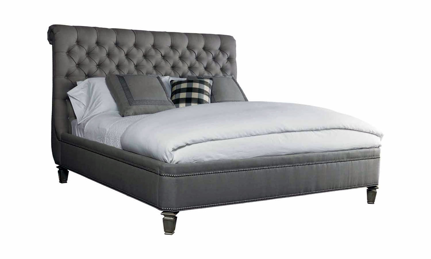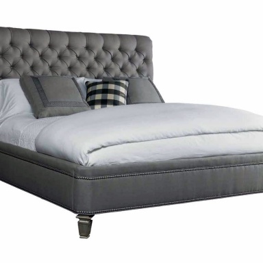 Bed with high headboard Devon from the American manufacturer Lillian August. The furniture is executed in classical style. Bed frame is made of durable solid wood that makes it durable in use, legs are silver plated. Grey fabric upholstery fixed furniture nails, high upholstered headboard is embellished with stitch Capito. Possible color variations in accordance with the manufacturer's catalogue.
