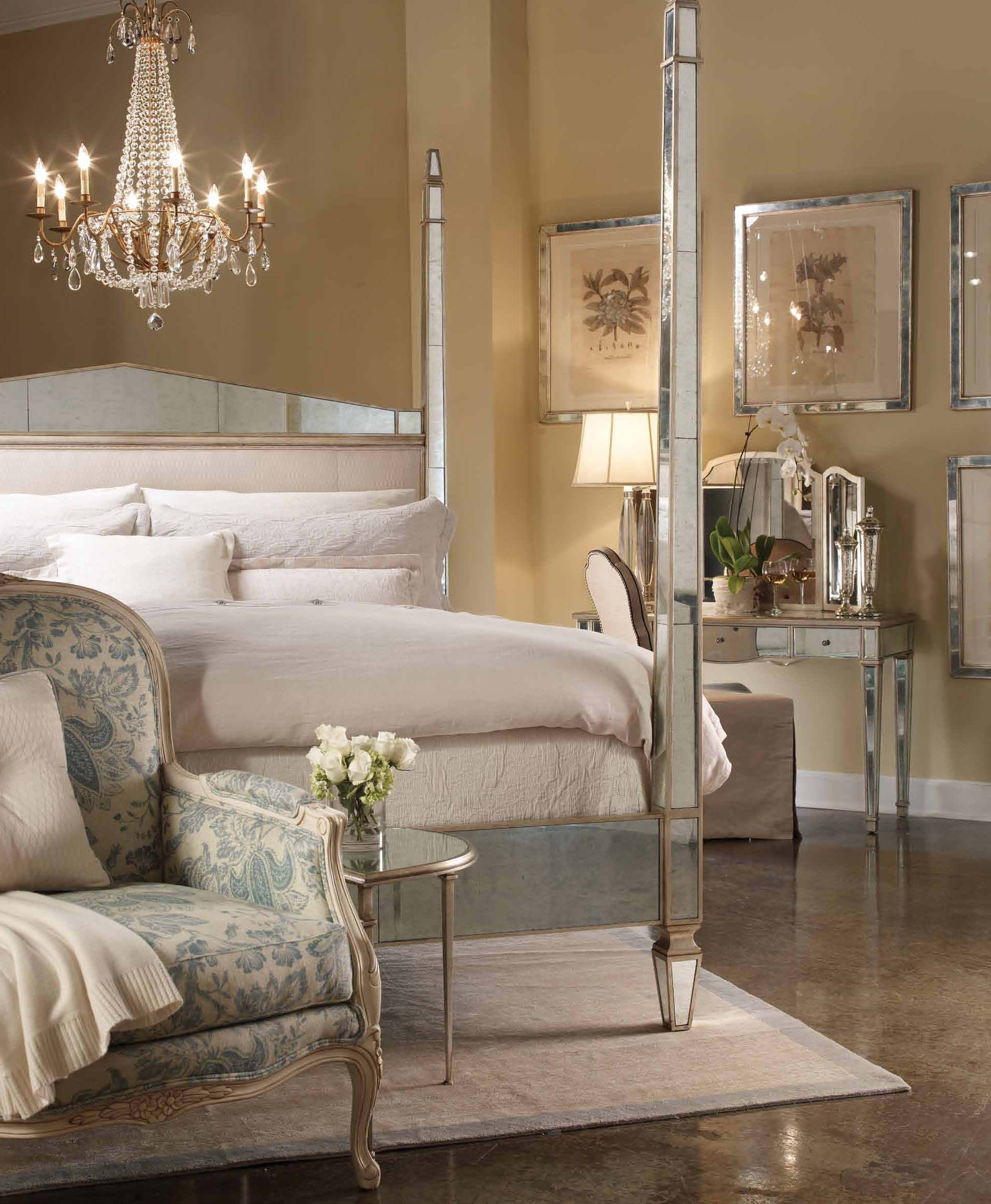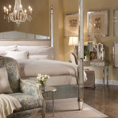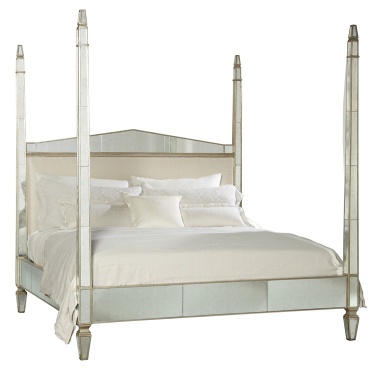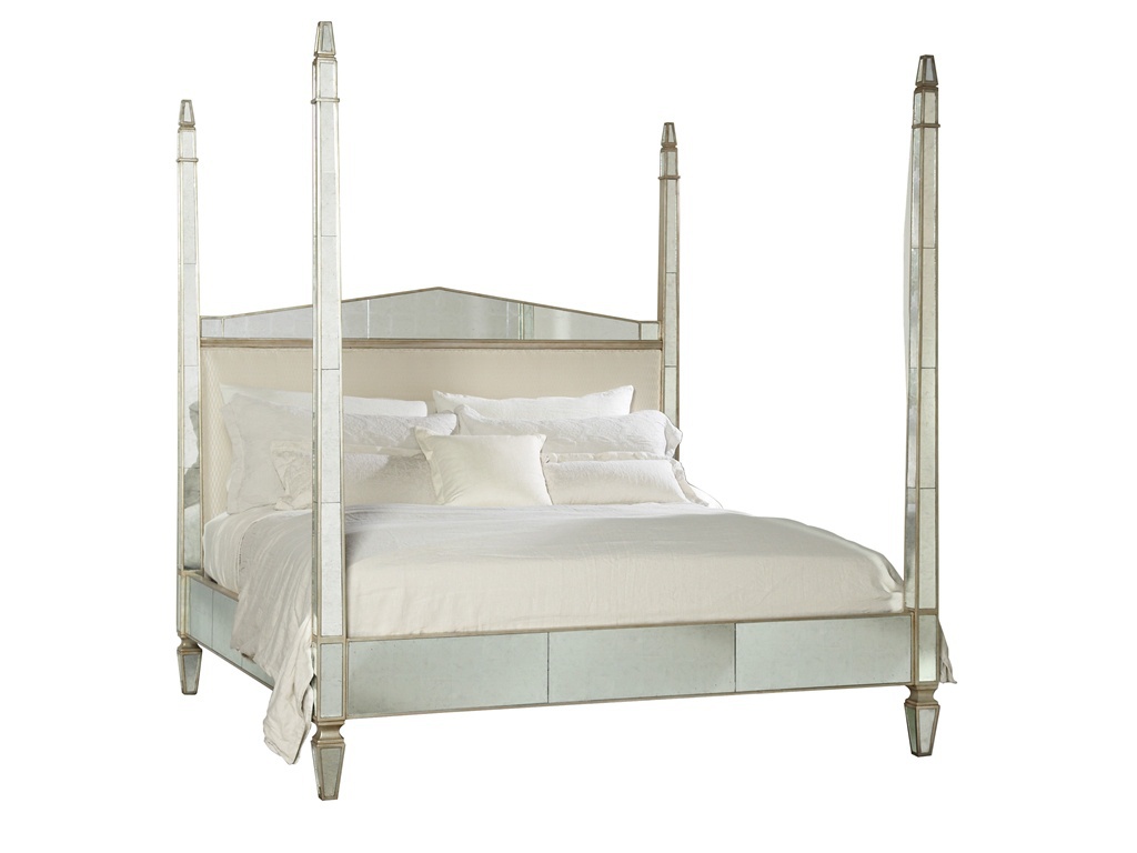 Bed with high headboard Arlington from the American manufacturer Lillian August. Frame of furniture is made of wood. Upholstered headboard in fabric. Color - white. Elegant style mixed with modernity. Bed with mirrored panels ready to transform your bedroom. One of the varieties of four-poster beds – with pillars to the ceiling at the edges. Color variations in the catalog of the manufacturer.