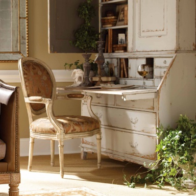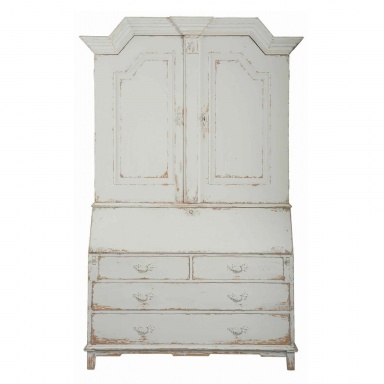 Secretaire Stefan from the American manufacturer Lillian August. Includes sections with hinged doors, drawers and flap. The body and legs from pine decorated antique. The finish is offered in white. Accessories metal. Colours in stock.