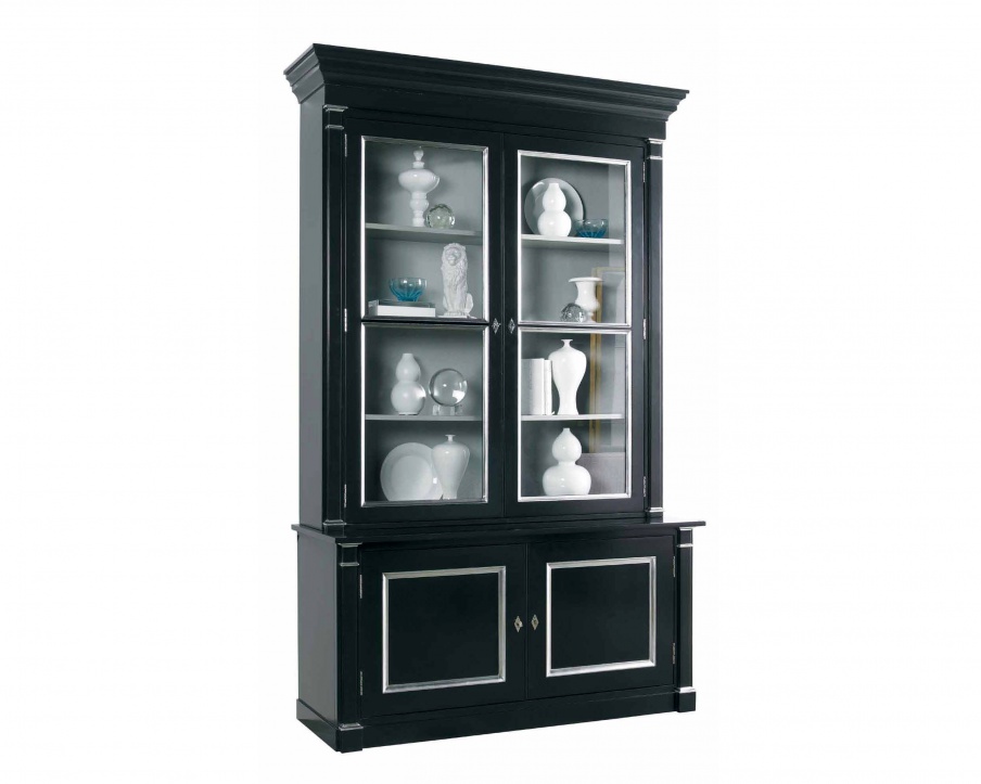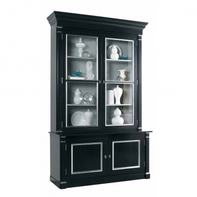 Bookcase Morrison American manufacturer of Lillian August. The model includes the glazed book shelves and closed sections. Body and legs made from solid wood. Decorative metal fittings. Color black, the facades are covered with silver paint. Possible color variations from a range of firms. The Cabinet is made in classic style.