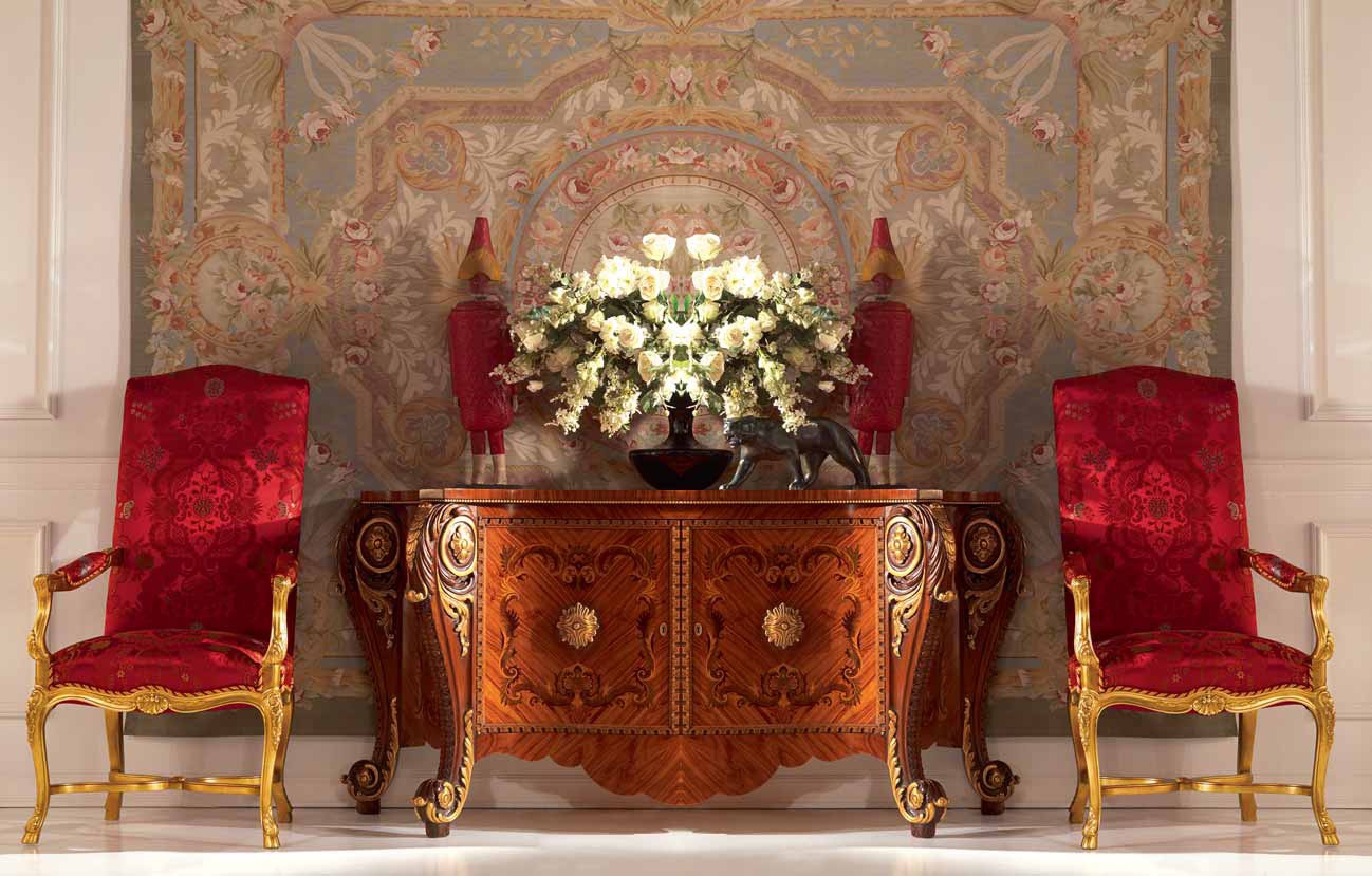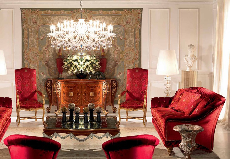 Sofa set Shanghay Capitonne Italian manufacturer Zanaboni. The presented model three-seater sofa, console, armchairs and coffee tables. The upholstery of the sofa and chairs in red tone in the combination of Golden tones. The console is low on figured legs. Console hinged doors, decorated with carved elements. The semi-circular sofa with soft armrests, seat cushion and backrest removable. The upholstery of the internal part is decorated with stitch Capito. Chair with rectangular high back and armrests. The tables in two versions sizes. Perfectly complement the interior in the Baroque style.