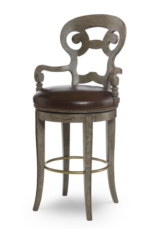 The Vienna Swivel bar stool from American manufacturer Century Furniture. The carved frame is hand made of solid wood. The seat is upholstered in textile or leather from the range of the manufacturer. Model in classic style with cover - patina. The presence of a comfortable backrest and footrests will be a real decoration of the dining room.