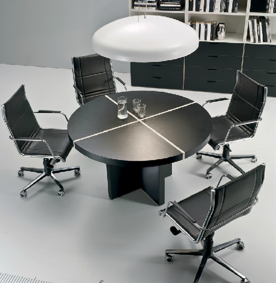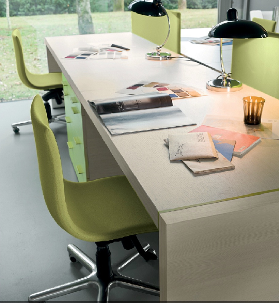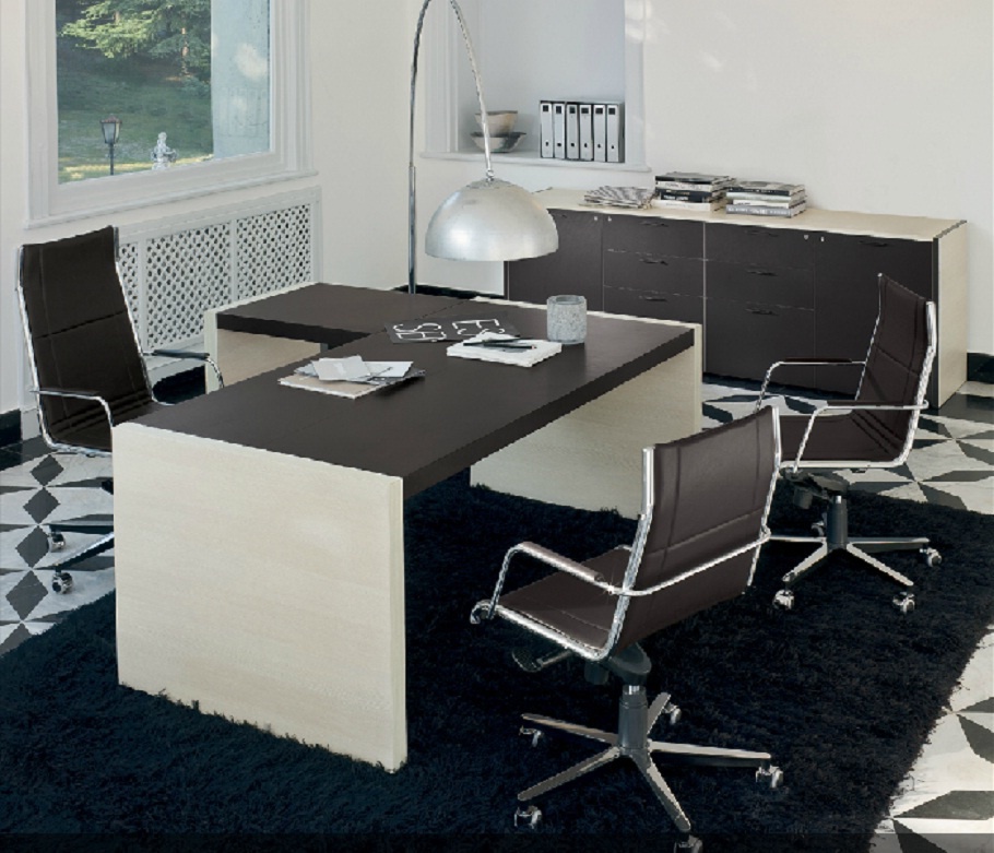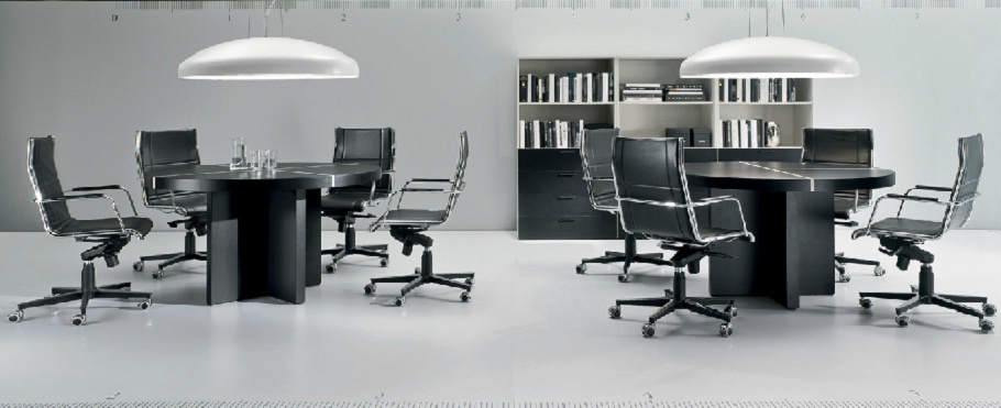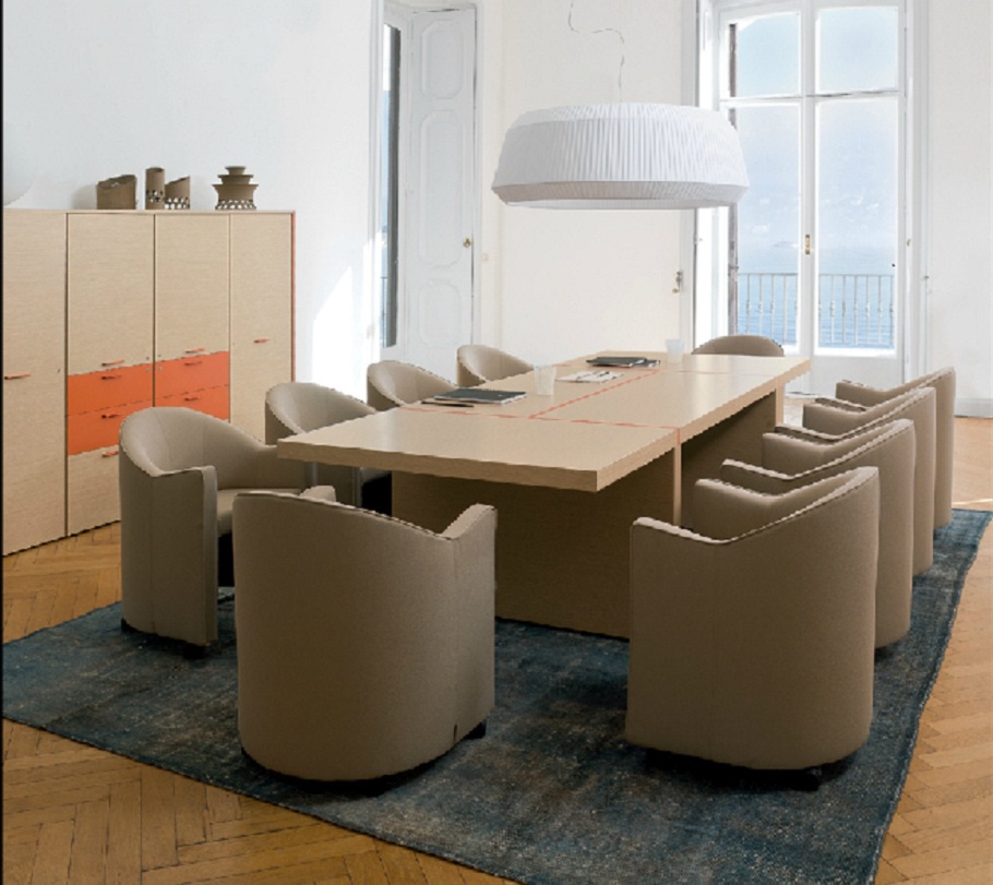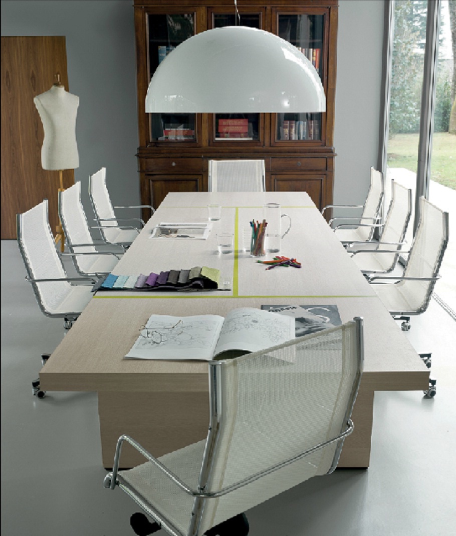 Office table Blade manufacturer from Italian i4 Mariani. A choice of Desk and conference table, rectangular and round. Table top and frame made of high quality particleboard, oak spanierman. The decor can be made of genuine leather. Offered several color finishes. Dimensions various - from the range of the manufacturer. Massive strict product design will give solidity to Your office or office space.