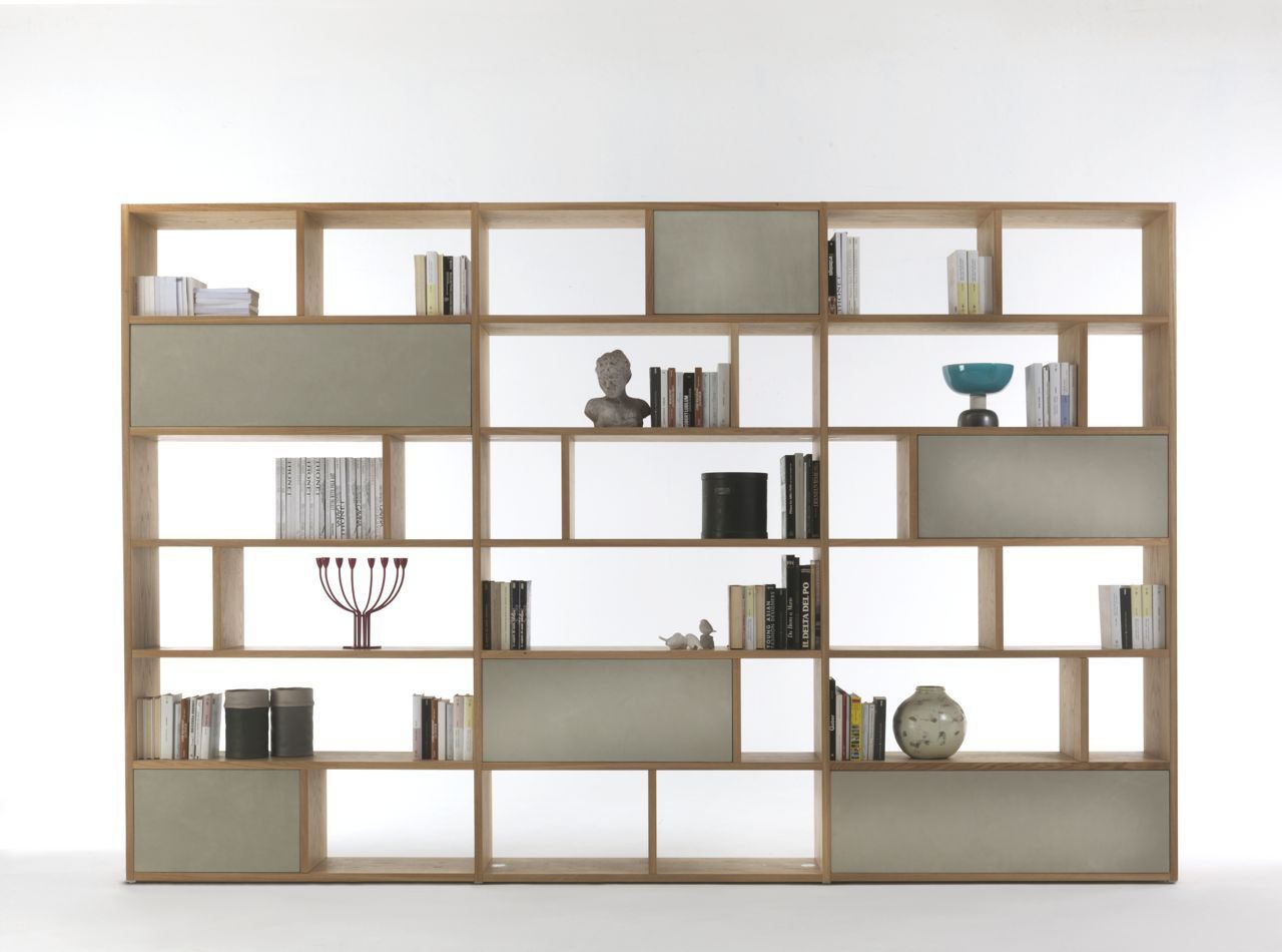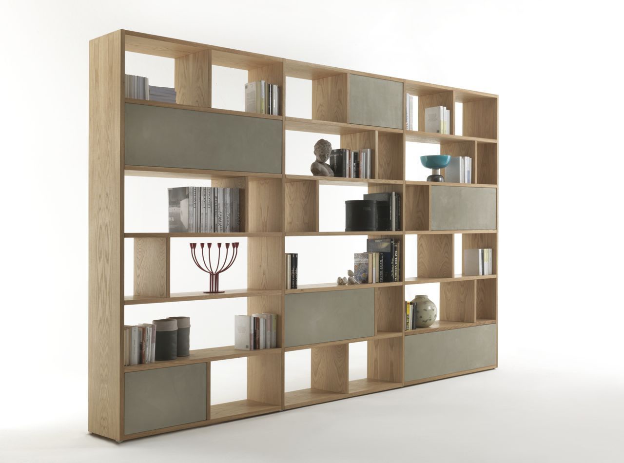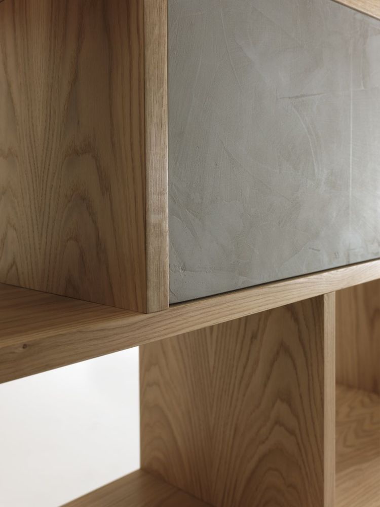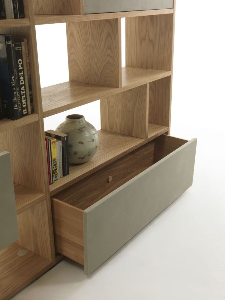 Password bookshelf from Italian manufacturer Riva 1920. Model with open shelves, drawers and doors. The Cabinet is available in a closed form, with back or front. Frame and shelves made of wood. The surface is covered with varnish. Doors and deep drawer front panels with the effect of concrete, made of lacquered glass or iron. Design in modern style. Color - natural wood.