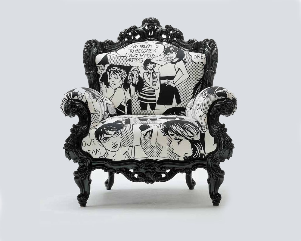 The chair Prince-Comics from the Italian manufacturer Moda. Upholstered furniture made of solid wood with fabric upholstery. Filler - polyurethane foam. The carved frame is covered with black lacquer. Fabric in black and white with designer print in comic style. Color in stock. The chair, in the style of pop art fits perfectly in the modern interiors, as well as in the living room in glamorous and Baroque combination.