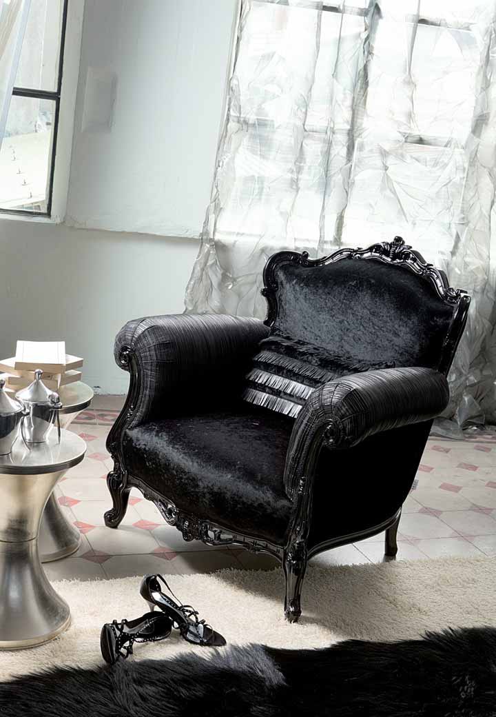 Happyhour armchair Vanity from Italian manufacturer Moda. Upholstered furniture made of solid wood with fabric upholstery black color, decorated with Bahrami. Filler - polyurethane foam. Carved frame, possible color variations, and different elements. The chair will fit perfectly into the interior in modern and Baroque style.