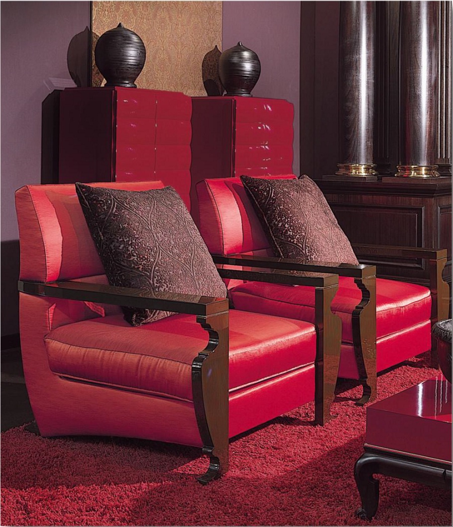 A chair from the Italian manufacturer Elledue. The base is made from solid wood, filler - foam, upholstery - textiles from the company portfolio. Armrests varnished. The composition is decorated with decorative pillows. The model is designed for the living room in art Deco style. Product color - catalogue of the manufacturer.