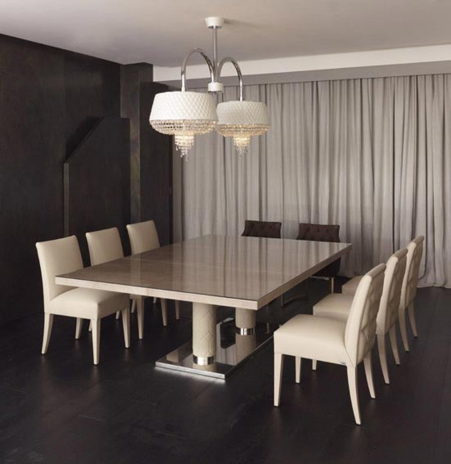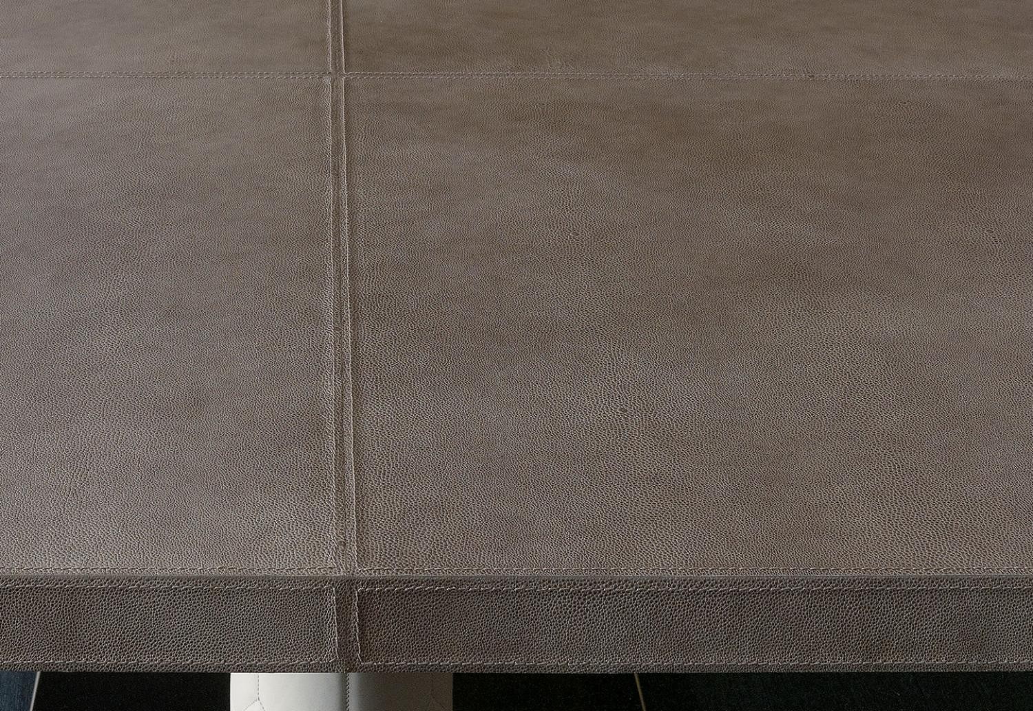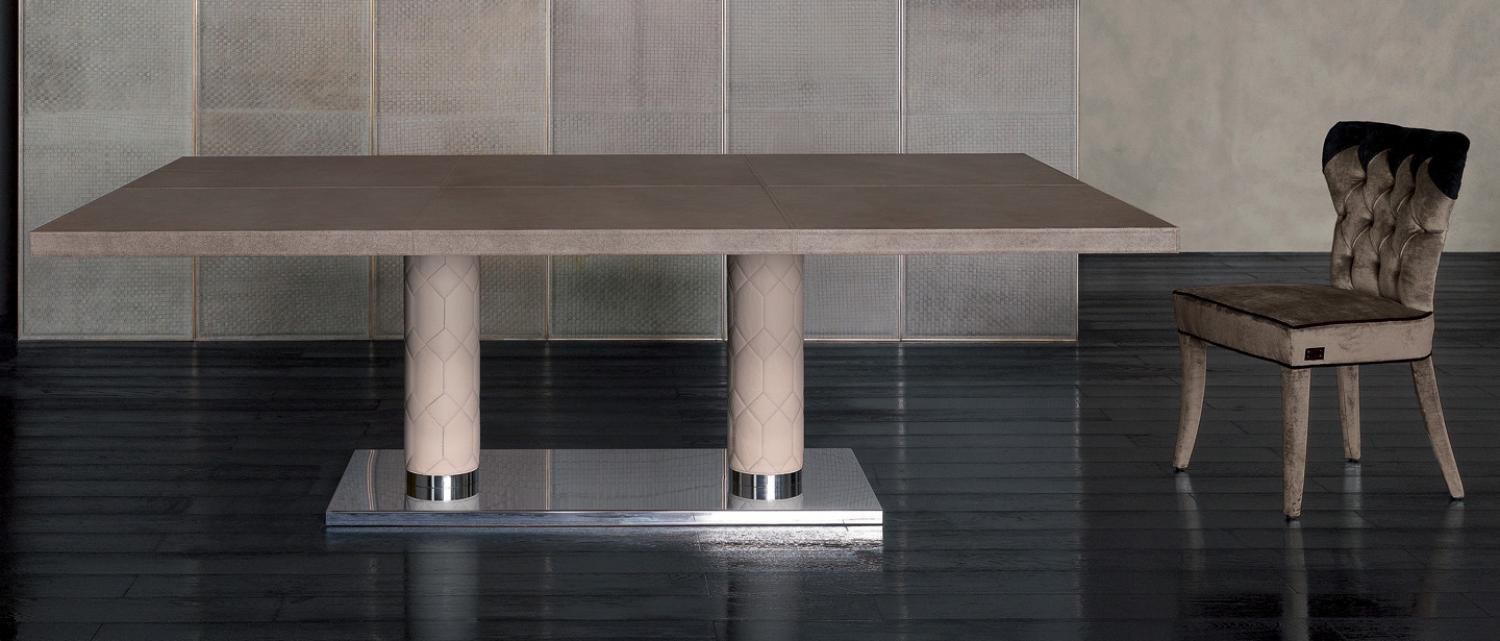 Dining table Fujico from the Italian manufacturer Rugiano. The base has a rectangular shape and cylindrical legs are made from steel or bronze. The table-top of rectangular shape may be formed in the finishing of leather, varnish or decorated with painting. For your convenience, the factory offers several sizes. The table surely will embellish your dining room interior in modern style with elements of glamour and art Deco.