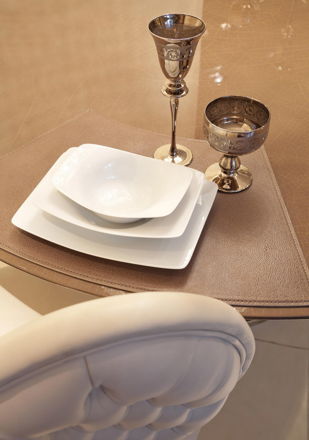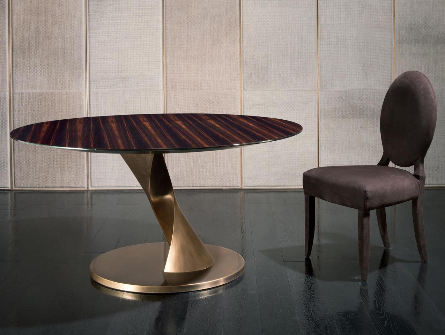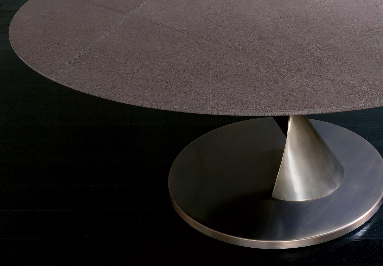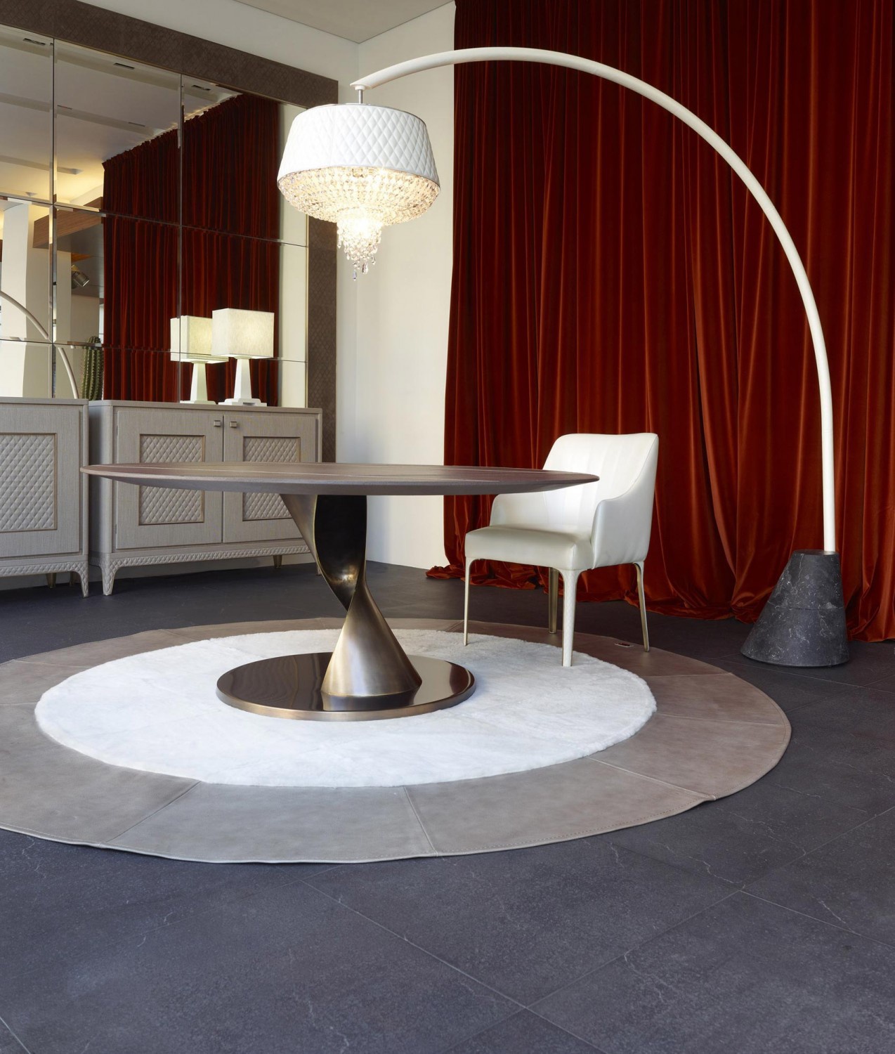 Zoe dining table from Italian manufacturer Rugiano. Round base and stem are made of aluminum or bronze. The top can also be made in the decoration of leather, ebony, oak or painted. The original table is sure to brighten your dining room interior.