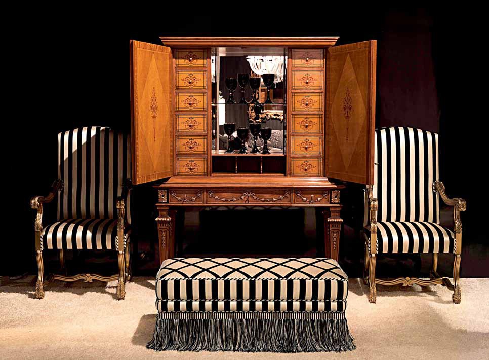 Sofa set Italian manufacturer Zanaboni. The presented models of chairs with armrests, a rectangular stool and the bar. Bar on high legs with swinging doors. Textile upholstery in black and white. The perfect solution for interior living room in Baroque style.