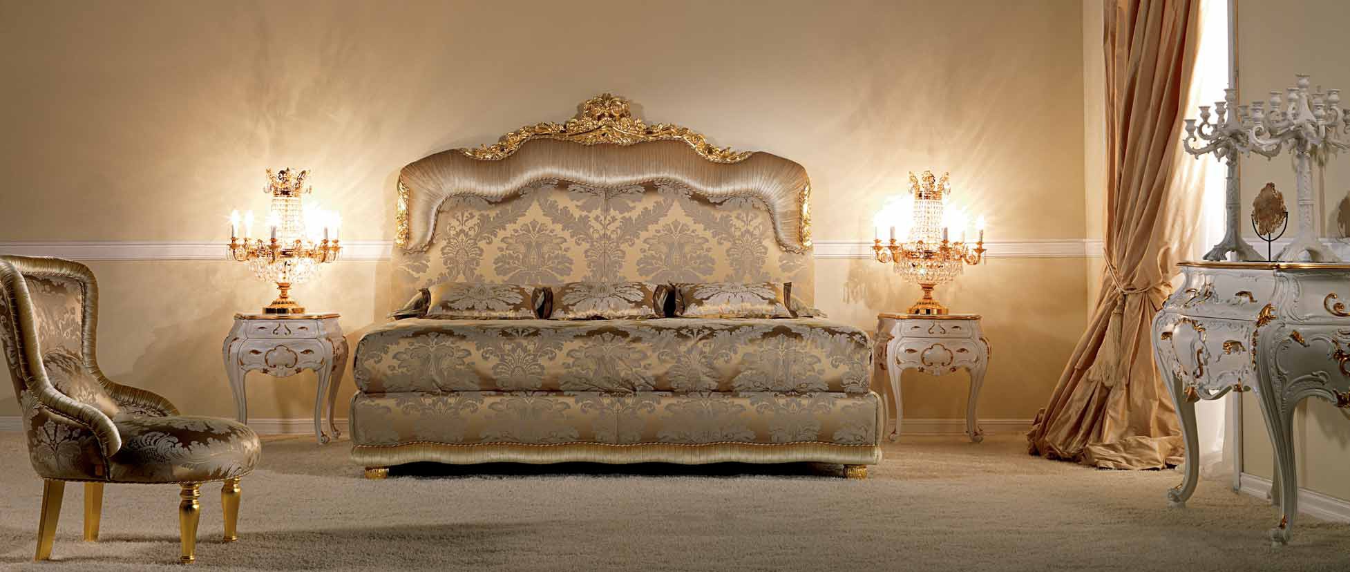 Double bed Caravaggio Italian manufacturer Zanaboni. Presents a model bed with a high headboard. The frame is made of wood. Upholstery made of high-quality textiles. Headboard with decorative carved elements and gold coating. Bed on a low figured legs. Color in combination of beige satin and gold. Will perfectly decorate a bedroom in the Baroque style.