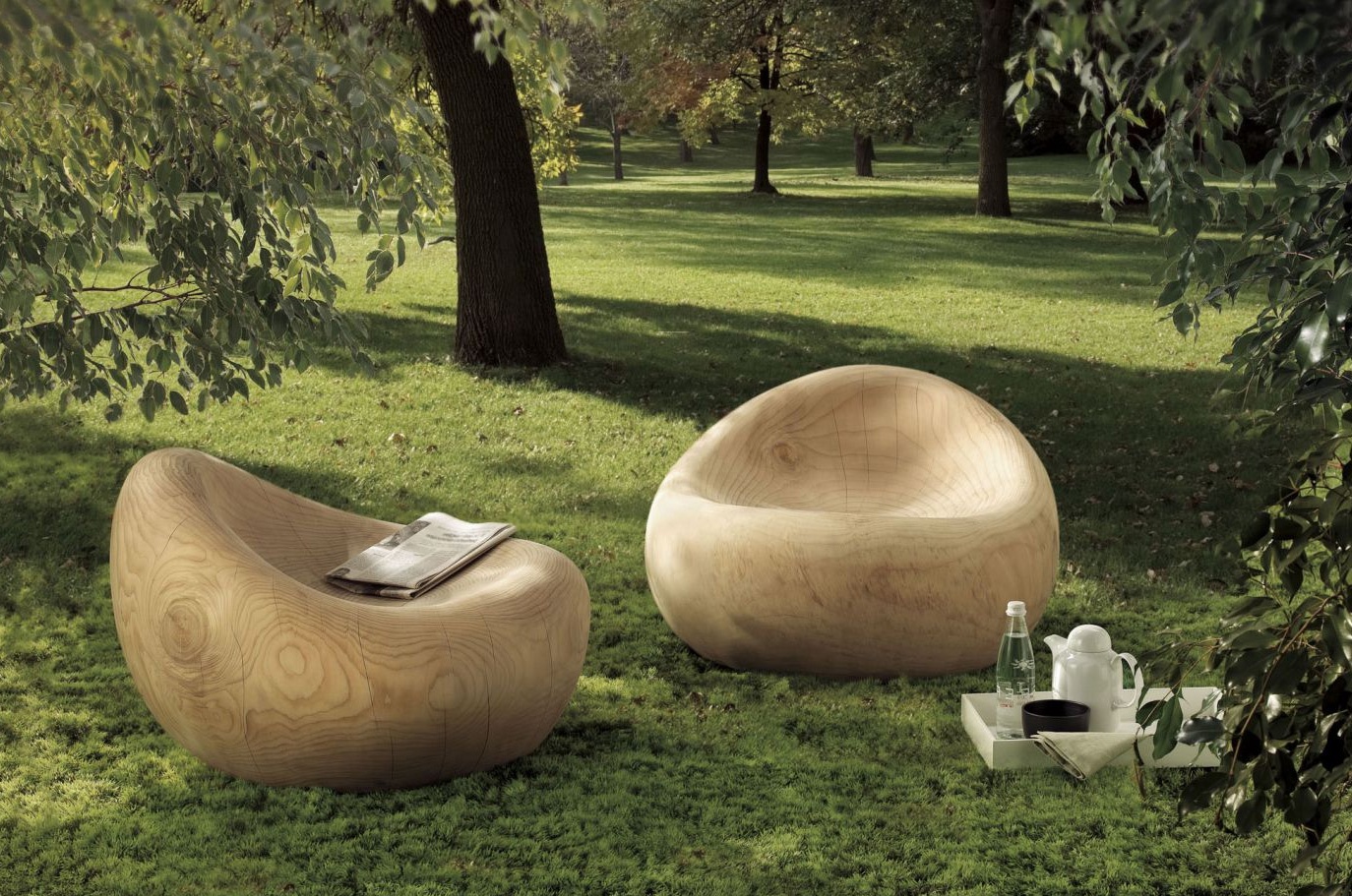 The Maui chair from the Italian manufacturer Riva 1920. The body of the chair is carved from a single piece of cedar wood. The chair is designed for use both indoors and outside. Cracks on the body of the chair is normal, as are the characteristic features of a solid piece of wood.