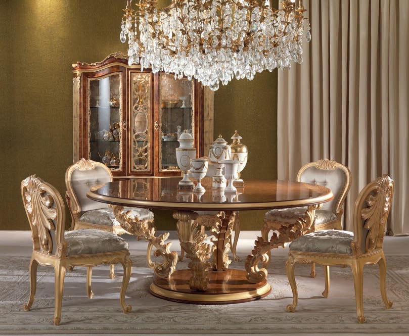 Set for the dining room from Italian manufacturer Jumbo Collection, collection Orleans. The frame is made from solid wood in a gilt finish. Soft seat and back, filler - foam, upholstery - textiles from a range of campaigns. Colours in stock.